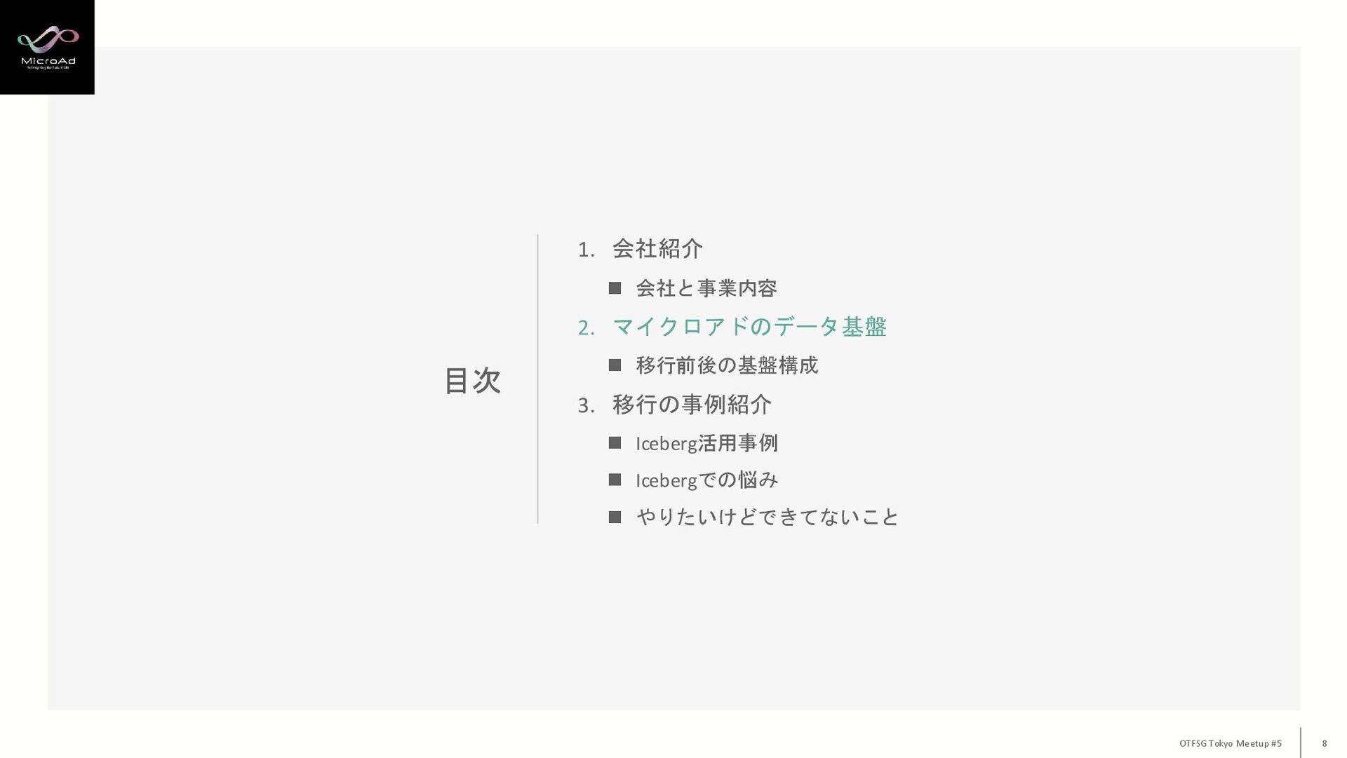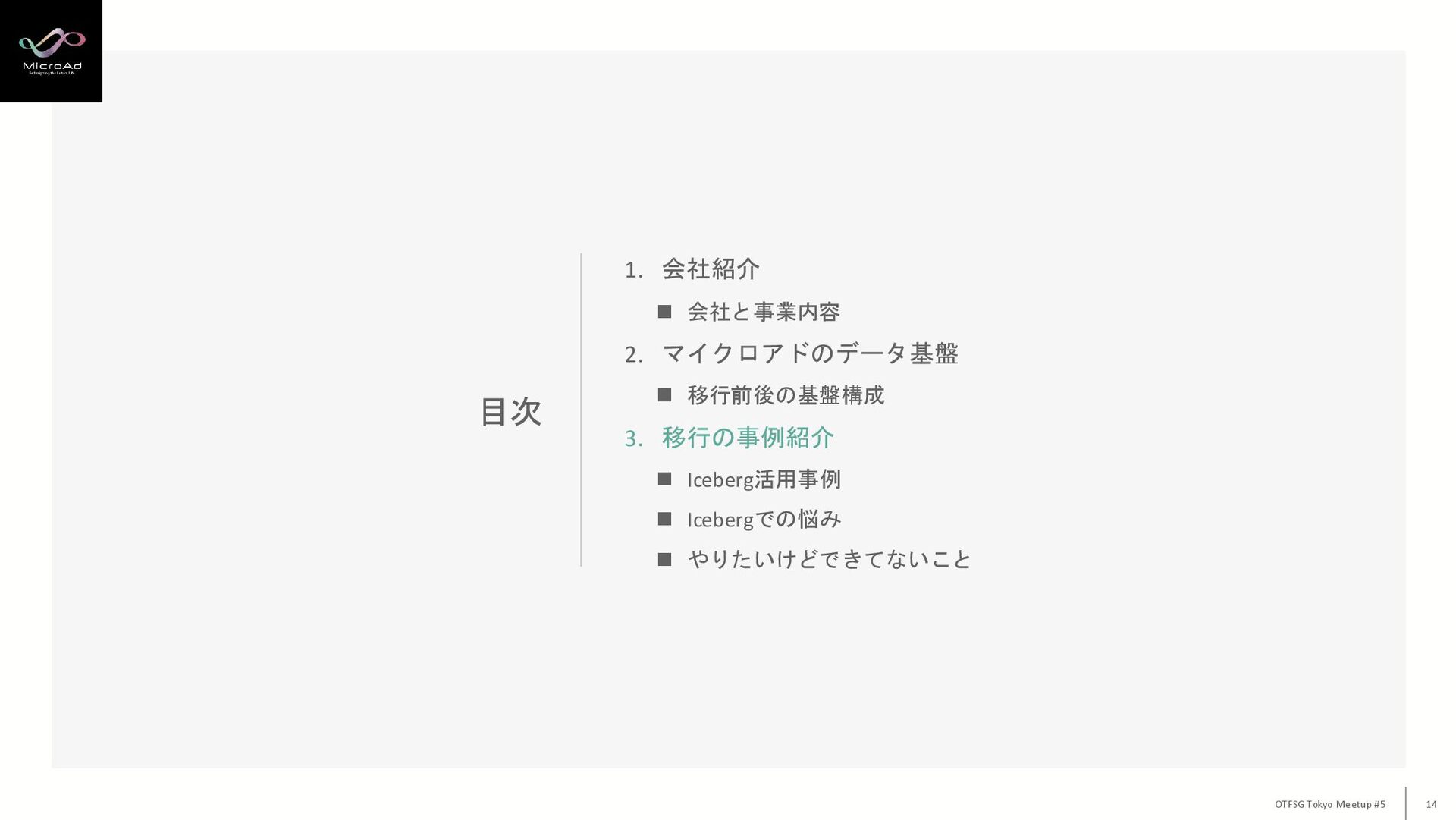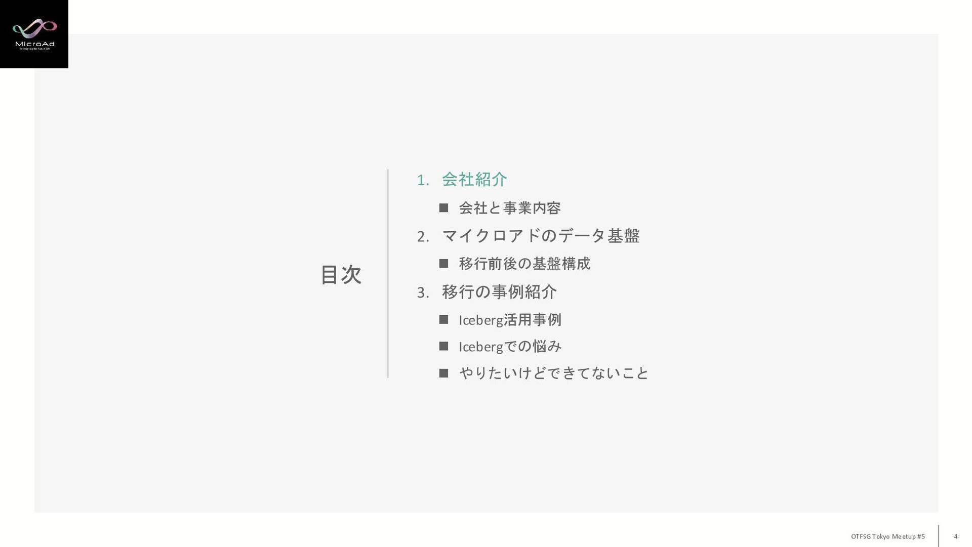 2. マイクロアドのデータ基盤 ◼ 移行前後の基盤構成 3. 移行の事例紹介 ◼ Iceberg活用事例 ◼ Icebergでの悩み ◼ やりたいけどできてないこと