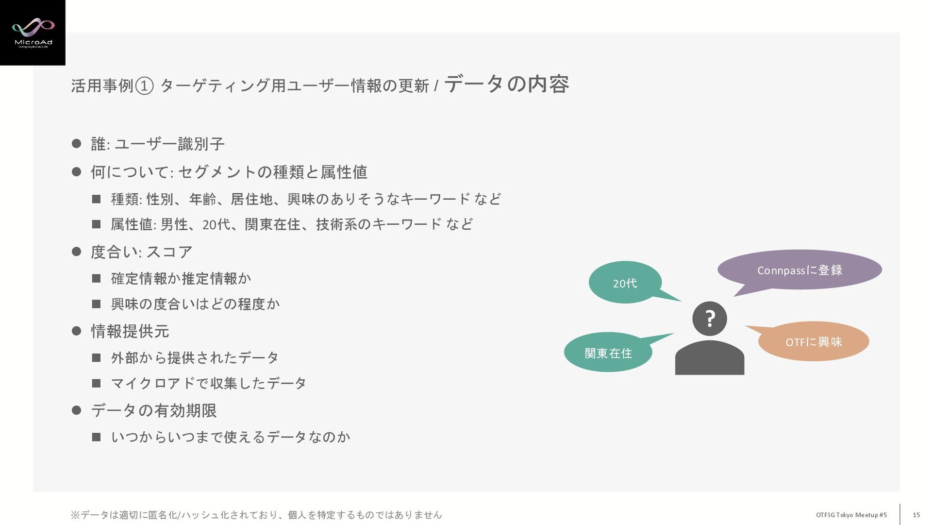 セグメントの種類と属性値 ◼ 種類: 性別、年齢、居住地、興味のありそうなキーワード など ◼ 属性値: 男性、20代、関東在住、技術系のキーワード など ⚫ 度合い: スコア ◼ 確定情報か推定情報か ◼ 興味の度合いはどの程度か ⚫ 情報提供元 ◼ 外部から提供されたデータ ◼ マイクロアドで収集したデータ ⚫ データの有効期限 ◼ いつからいつまで使えるデータなのか 活用事例① ターゲティング用ユーザー情報の更新 / データの内容 ? 20代 関東在住 OTFに興味 Connpassに登録 ※データは適切に匿名化/ハッシュ化されており、個人を特定するものではありません