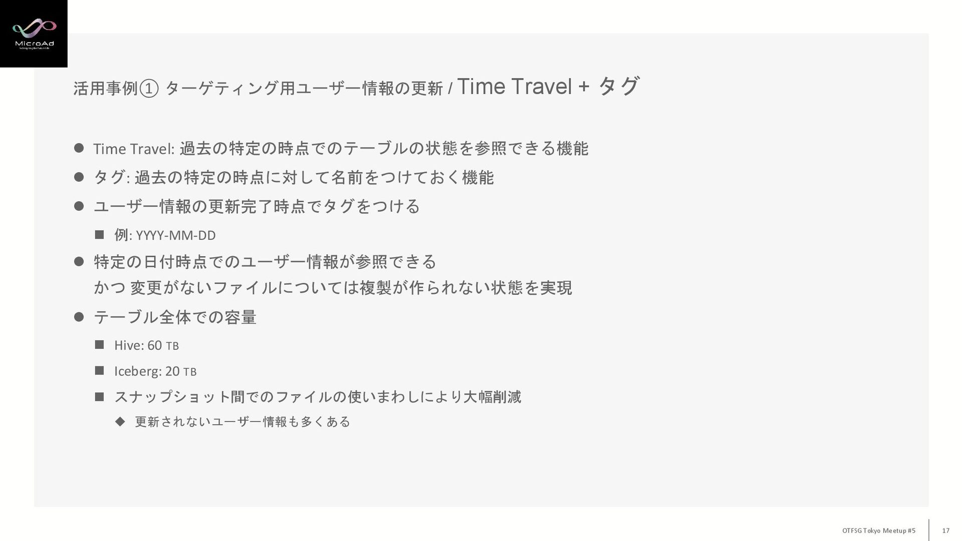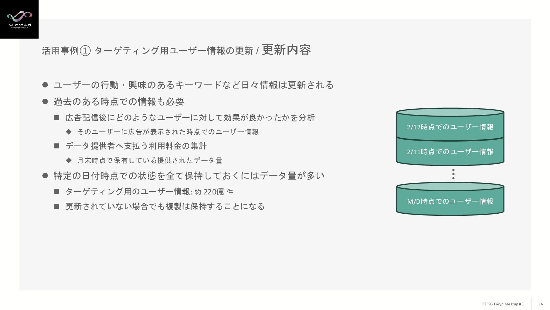 OTFSG Tokyo Meetup #5 16 ⚫ ユーザーの行動・興味のあるキーワードなど日々情報は更新される ⚫ 過去のある時点での情報も必要 ◼