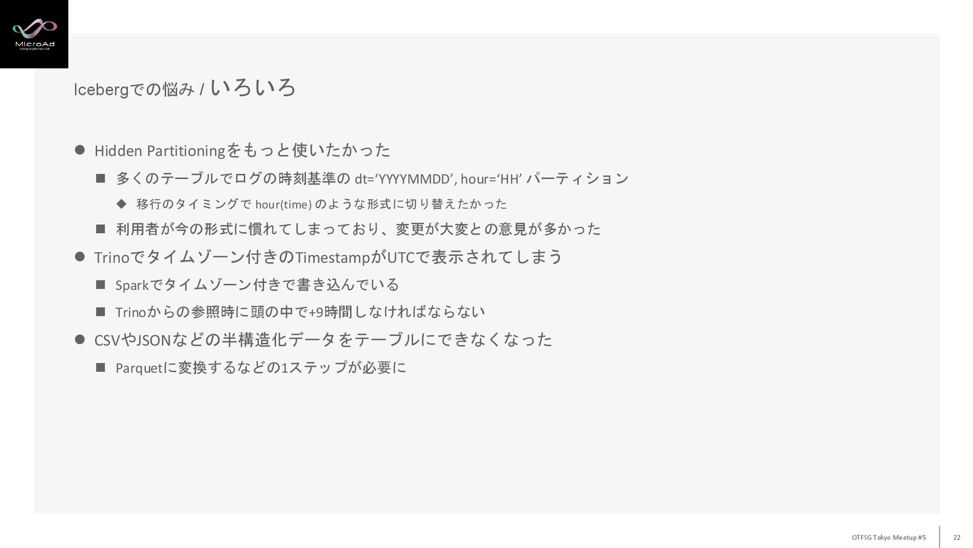 Icebergでの悩み / いろいろ OTFSG Tokyo Meetup #5 22 ⚫ Hidden