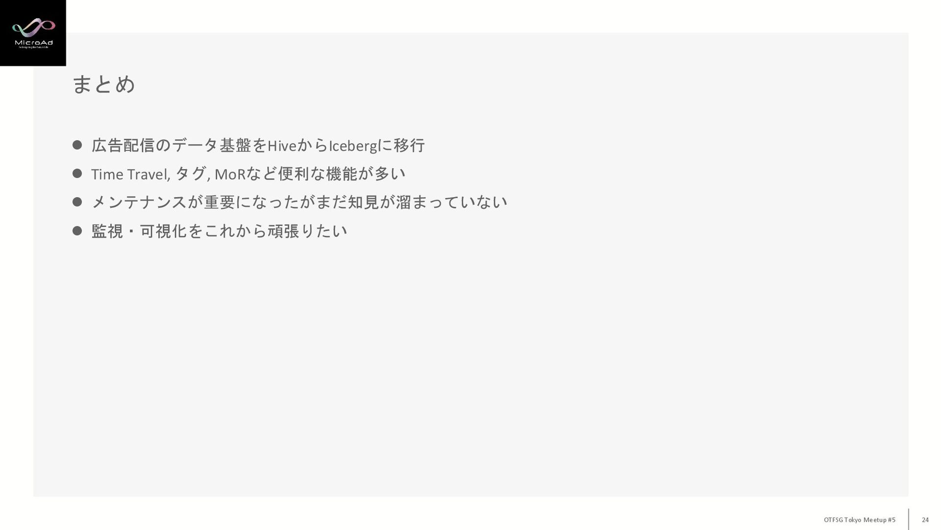まとめ OTFSG Tokyo Meetup #5 24 ⚫ 広告配信のデータ基盤をHiveからIcebergに移行 ⚫ Time