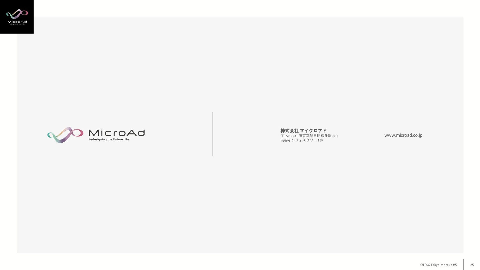 株式会社 マイクロアド 〒150-0031 東京都渋谷区桜丘町20-1 渋谷インフォスタワー 13F www.microad.co.jp OTFSG Tokyo Meetup