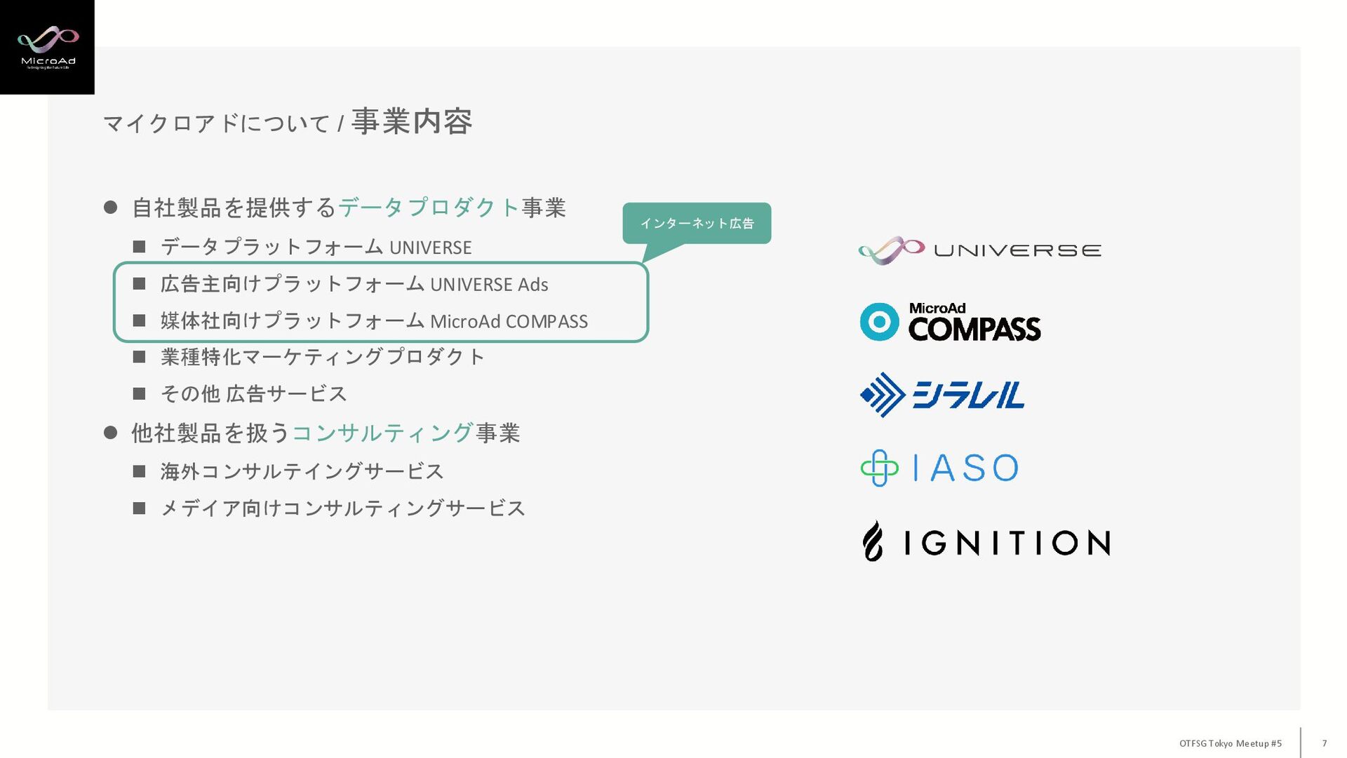マイクロアドについて / 事業内容 OTFSG Tokyo Meetup #5 7 ⚫ 自社製品を提供するデータプロダクト事業