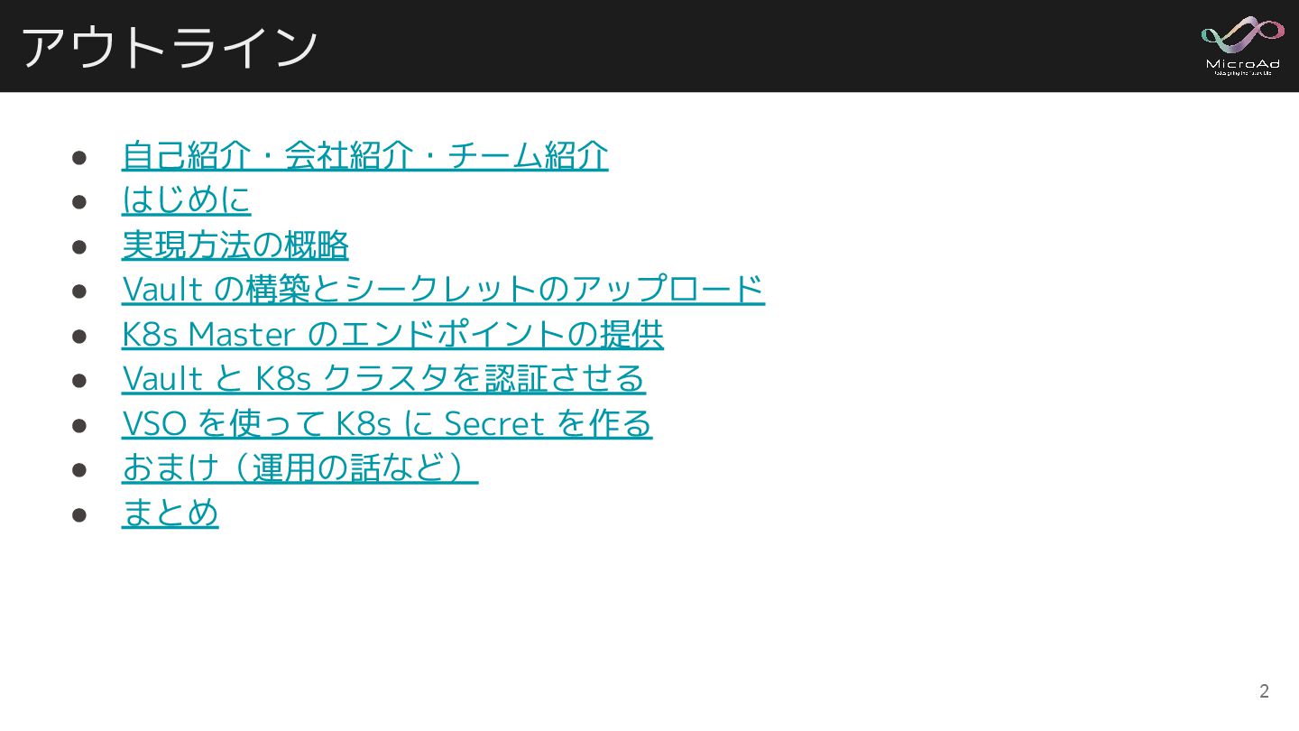 • K8s Master のエンドポイントの提供 • Vault と K8s クラスタを認証させる • VSO を使って K8s に Secret を作る • おまけ(運用の話など) • まとめ 2