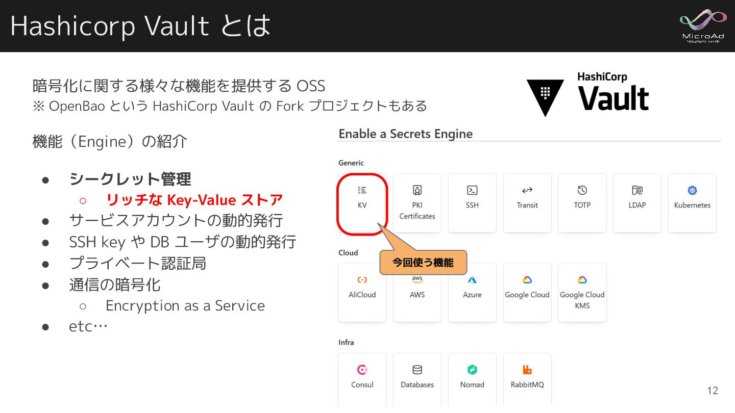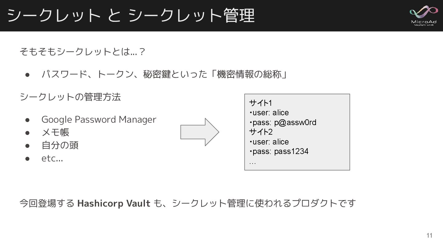 Manager • メモ帳 • 自分の頭 • etc... 今回登場する Hashicorp Vault も、シークレット管理に使われるプロダクトです 11 サイト1 ・user: alice ・pass: p@assw0rd サイト2 ・user: alice ・pass: pass1234 …