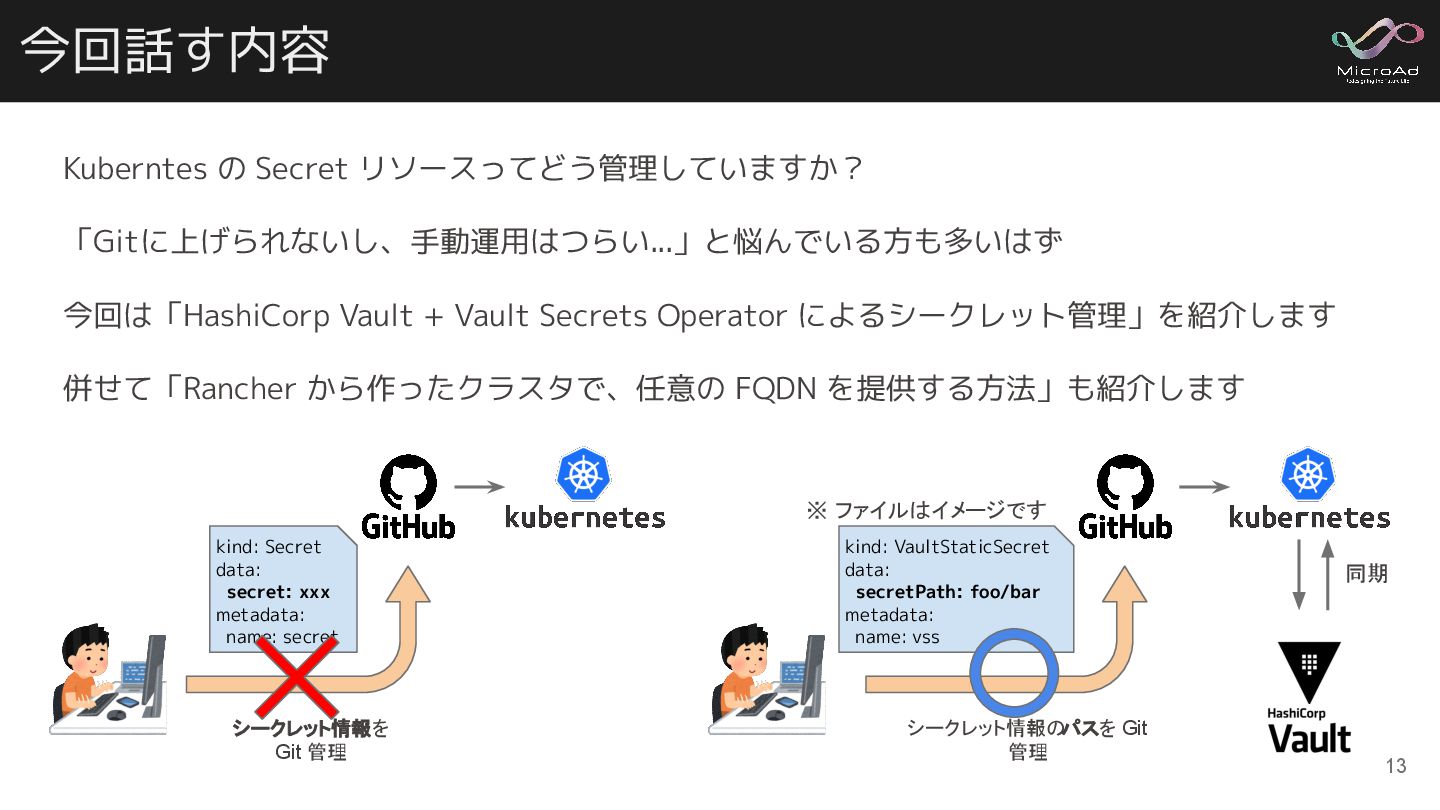 Secrets Operator によるシークレット管理」を紹介します 併せて「Rancher から作ったクラスタで、任意の FQDN を提供する方法」も紹介します 13 kind: Secret data: secret: xxx metadata: name: secret シークレット情報を Git 管理 kind: VaultStaticSecret data: secretPath: foo/bar metadata: name: vss シークレット情報の パスを Git 管理 ※ ファイルはイメージです 同期