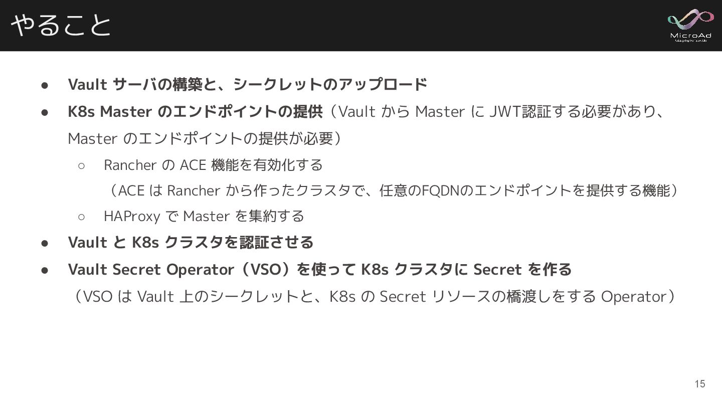 やること • Vault サーバの構築と、シークレットのアップロード • K8s Master のエンドポイントの提供(Vault から Master