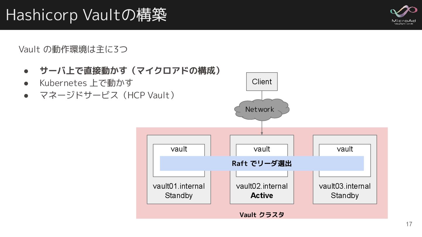 上で動かす • マネージドサービス(HCP Vault) 17 vault01.internal Standby vault02.internal Active vault03.internal Standby Client Network vault vault vault Raft でリーダ選出