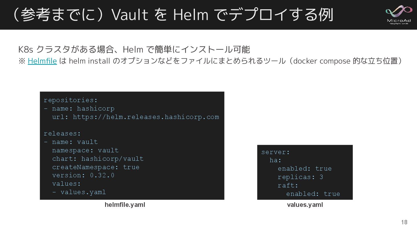 (参考までに)Vault を Helm でデプロイする例 K8s クラスタがある場合、Helm で簡単にインストール可能 ※ Helmfile は