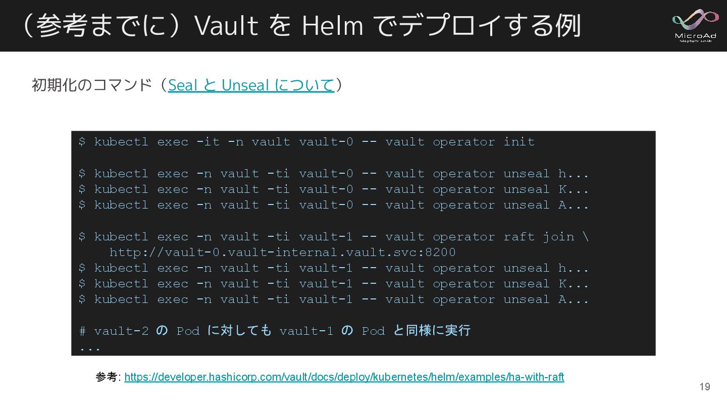 (参考までに)Vault を Helm でデプロイする例 19 $ kubectl exec -it -n