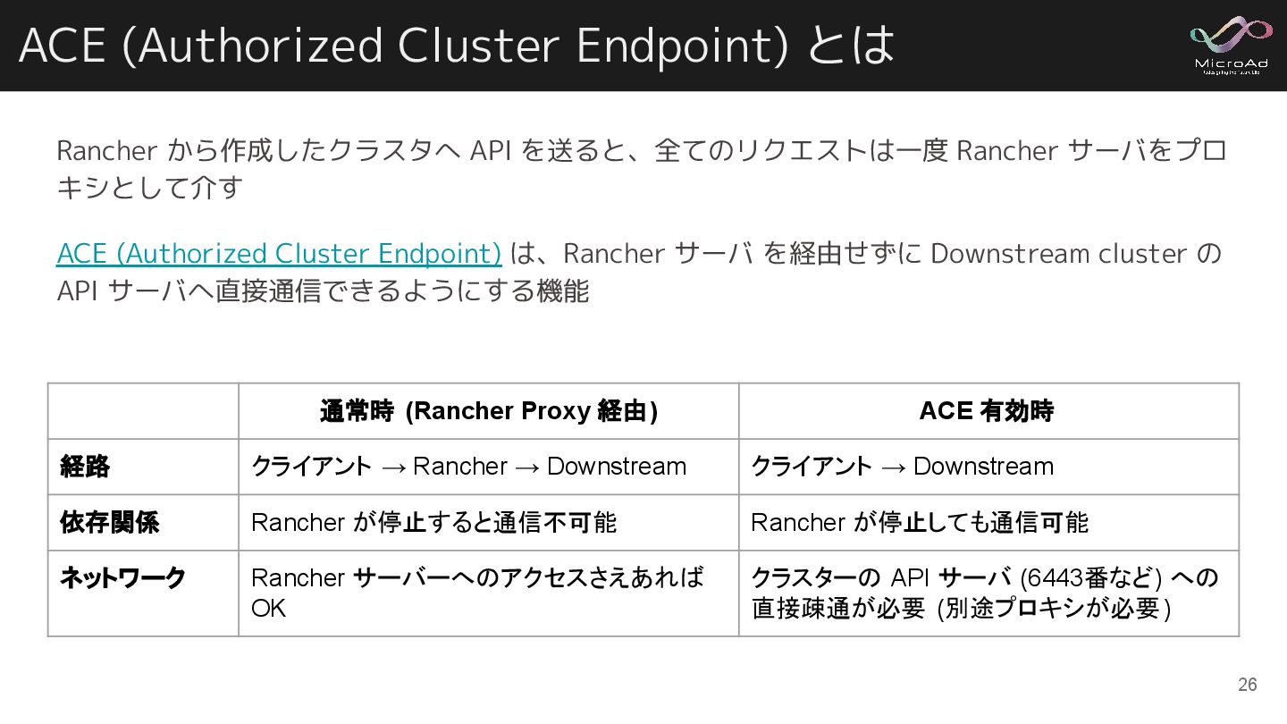 サーバをプロ キシとして介す ACE (Authorized Cluster Endpoint) は、Rancher サーバ を経由せずに Downstream cluster の API サーバへ直接通信できるようにする機能 26 通常時 (Rancher Proxy 経由) ACE 有効時 経路 クライアント → Rancher → Downstream クライアント → Downstream 依存関係 Rancher が停止すると通信不可能 Rancher が停止しても通信可能 ネットワーク Rancher サーバーへのアクセスさえあれば OK クラスターの API サーバ (6443番など) への 直接疎通が必要 (別途プロキシが必要 )