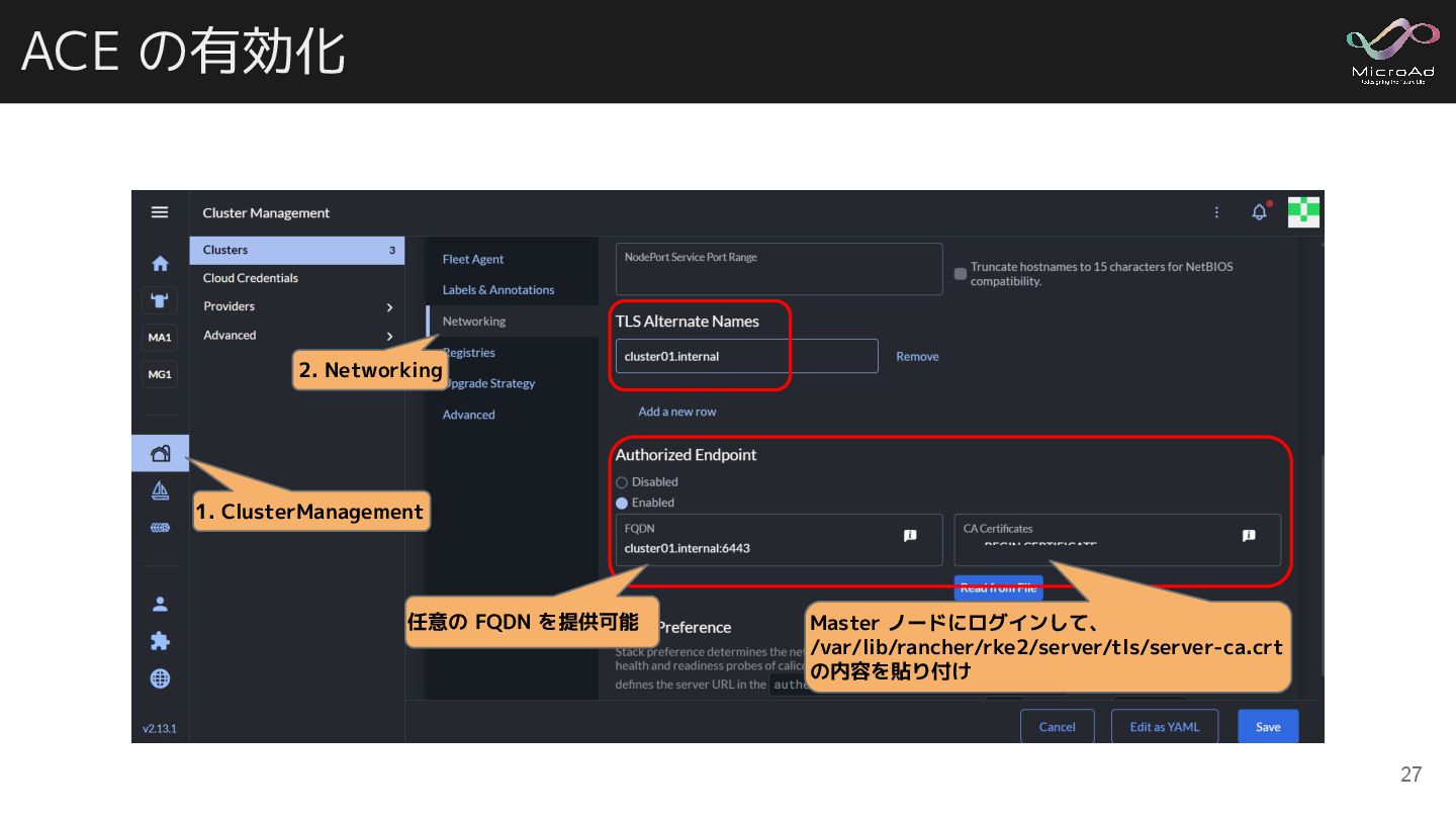 ACE の有効化 27 1. ClusterManagement 2. Networking Master ノードにログインして、 /var/lib/rancher/rke2/server/tls/server-ca.crt