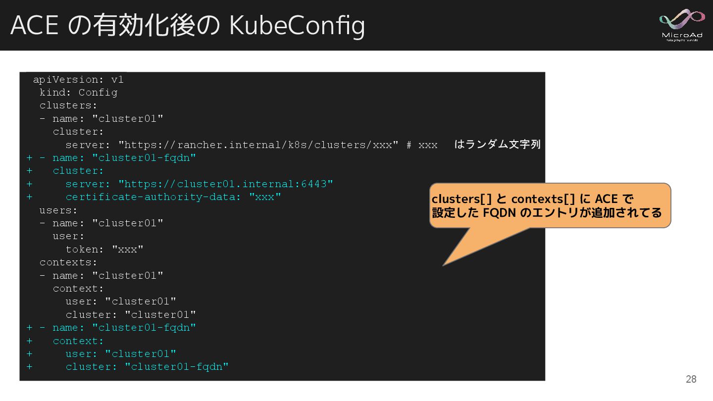 ACE の有効化後の KubeConfig 28 apiVersion: v1 kind: Config clusters: -