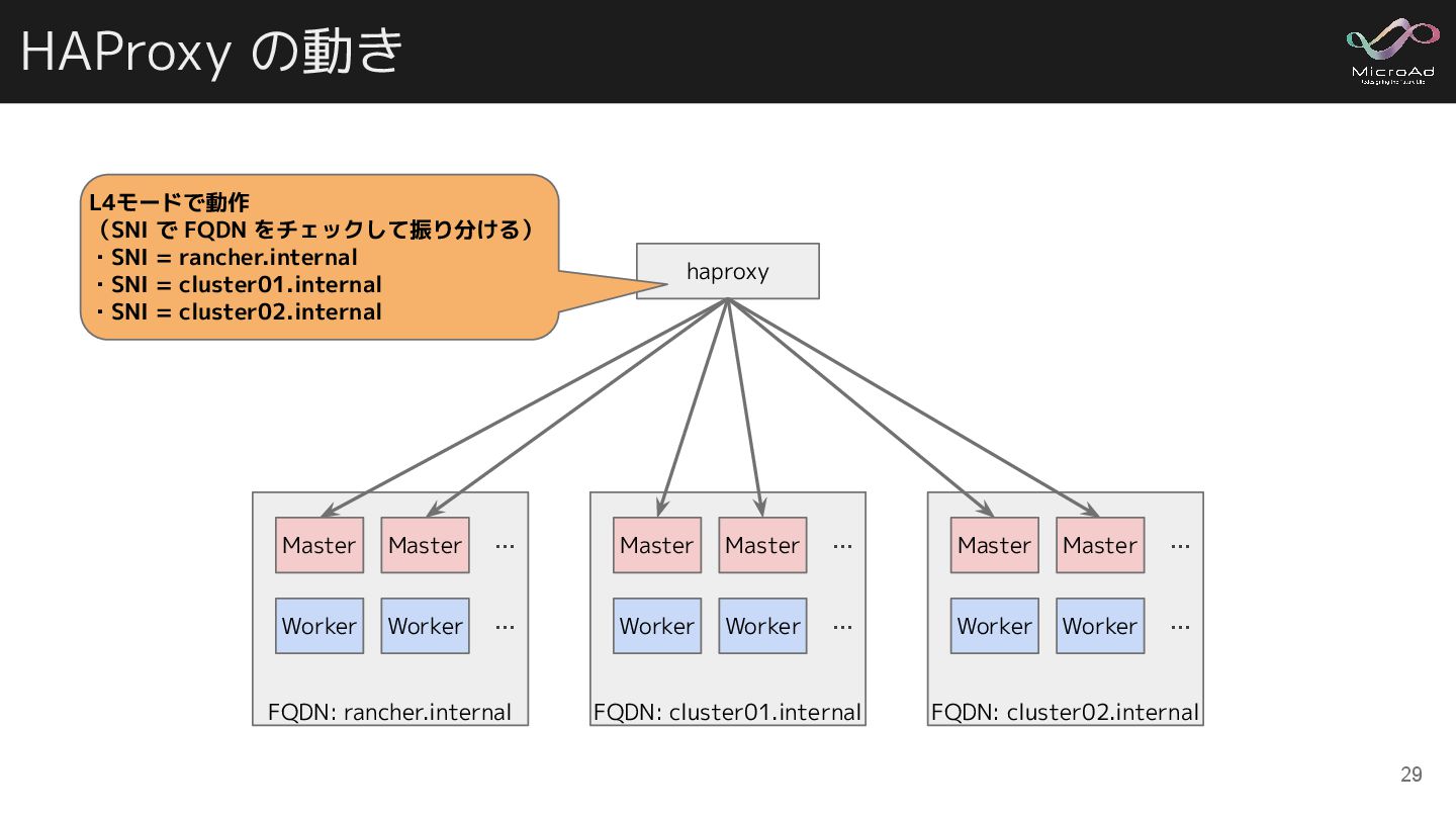 Worker … FQDN: cluster01.internal Master Master … Worker Worker … FQDN: cluster02.internal Master Master … Worker Worker … L4モードで動作 (SNI で FQDN をチェックして振り分ける) ・SNI = rancher.internal ・SNI = cluster01.internal ・SNI = cluster02.internal