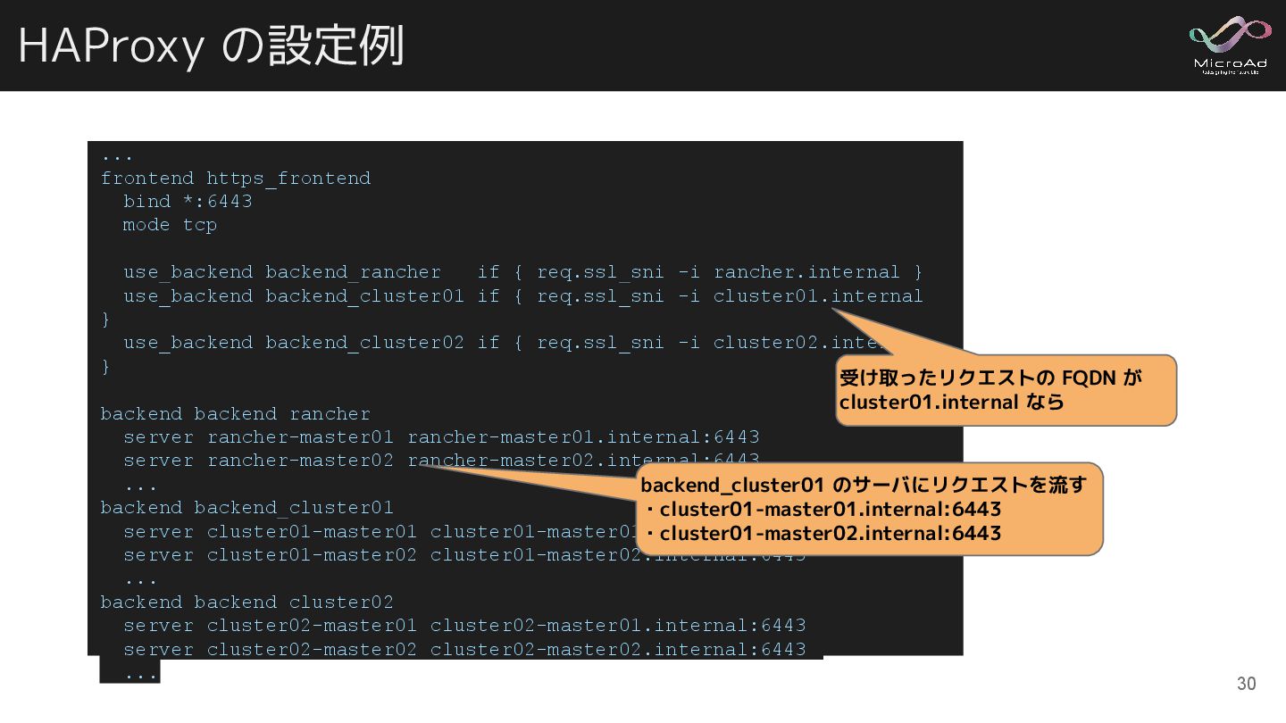 use_backend backend_rancher if { req.ssl_sni -i rancher.internal } use_backend backend_cluster01 if { req.ssl_sni -i cluster01.internal } use_backend backend_cluster02 if { req.ssl_sni -i cluster02.internal } backend backend_rancher server rancher-master01 rancher-master01.internal:6443 server rancher-master02 rancher-master02.internal:6443 ... backend backend_cluster01 server cluster01-master01 cluster01-master01.internal:6443 server cluster01-master02 cluster01-master02.internal:6443 ... backend backend_cluster02 server cluster02-master01 cluster02-master01.internal:6443 server cluster02-master02 cluster02-master02.internal:6443 ... 受け取ったリクエストの FQDN が cluster01.internal なら backend_cluster01 のサーバにリクエストを流す ・cluster01-master01.internal:6443 ・cluster01-master02.internal:6443