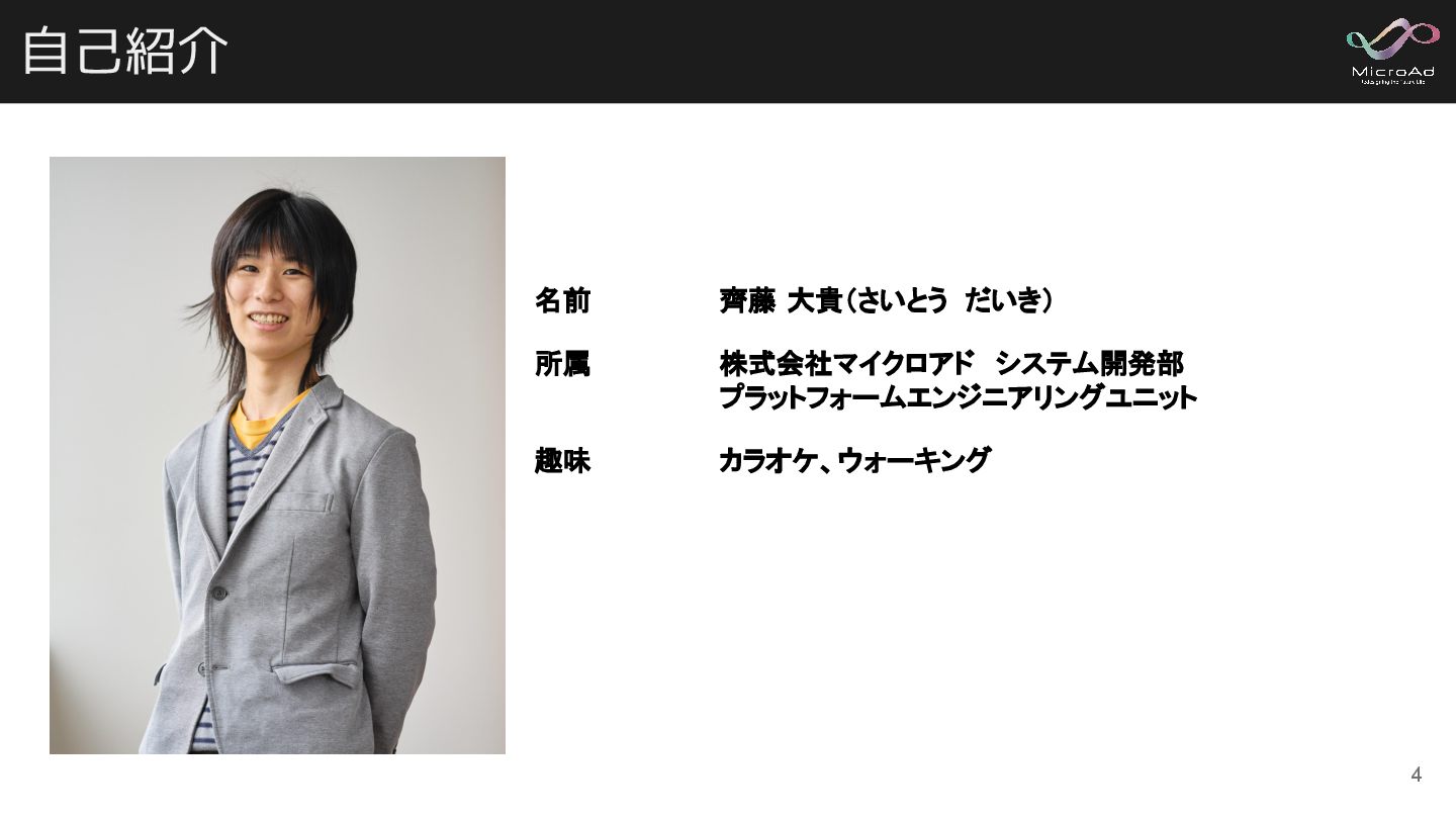 自己紹介 名前 齊藤 大貴(さいとう だいき) 所属 株式会社マイクロアド システム開発部 プラットフォームエンジニアリングユニット 趣味