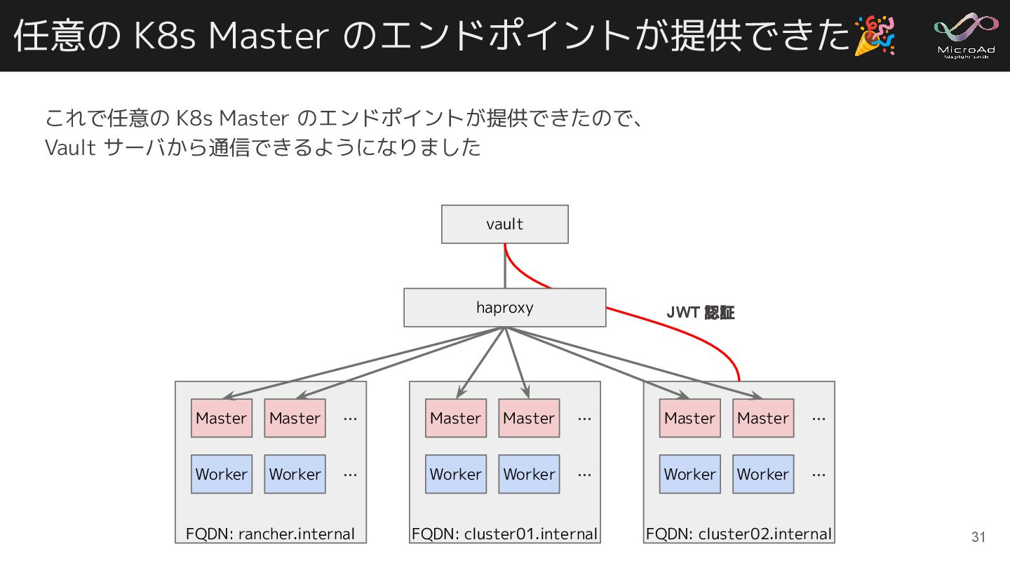 31 FQDN: rancher.internal Master Master … Worker Worker … FQDN: cluster01.internal Master Master … Worker Worker … FQDN: cluster02.internal Master Master … Worker Worker … vault JWT 認証 haproxy