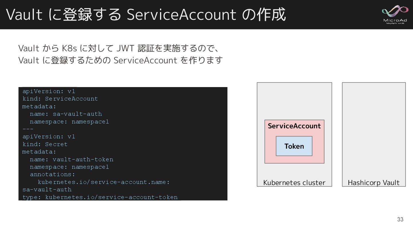 Vault に登録するための ServiceAccount を作ります 33 apiVersion: v1 kind: ServiceAccount metadata: name: sa-vault-auth namespace: namespace1 --- apiVersion: v1 kind: Secret metadata: name: vault-auth-token namespace: namespace1 annotations: kubernetes.io/service-account.name: sa-vault-auth type: kubernetes.io/service-account-token Hashicorp Vault Kubernetes cluster ServiceAccount Token