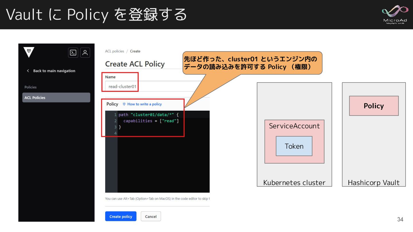 Vault に Policy を登録する 34 先ほど作った、cluster01 というエンジン内の データの読み込みを許可する Policy (権限)