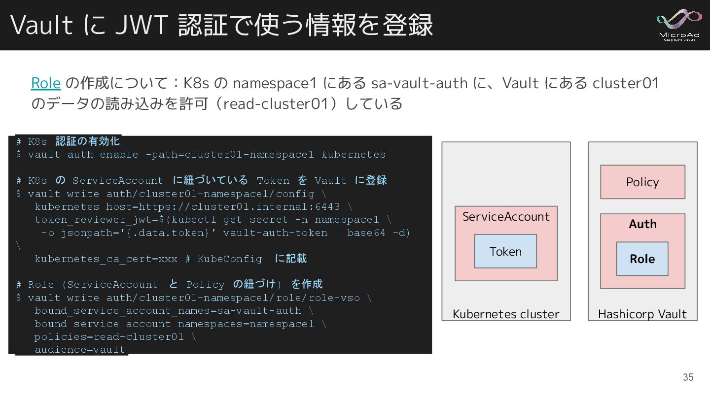 Vault に JWT 認証で使う情報を登録 35 # K8s 認証の有効化 $ vault