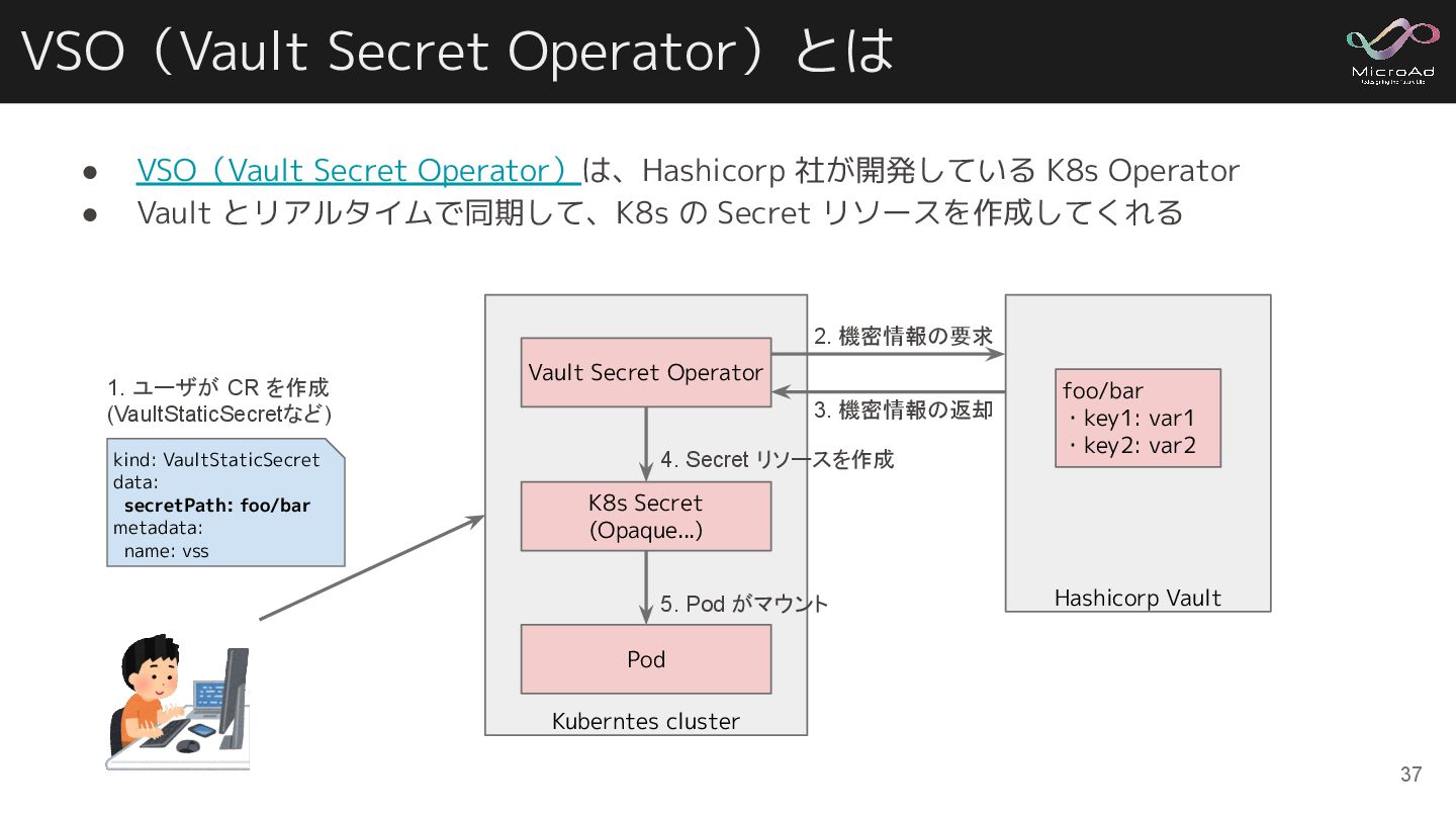 Kuberntes cluster VSO(Vault Secret Operator)とは • VSO(Vault Secret Operator)は、Hashicorp 社が開発している