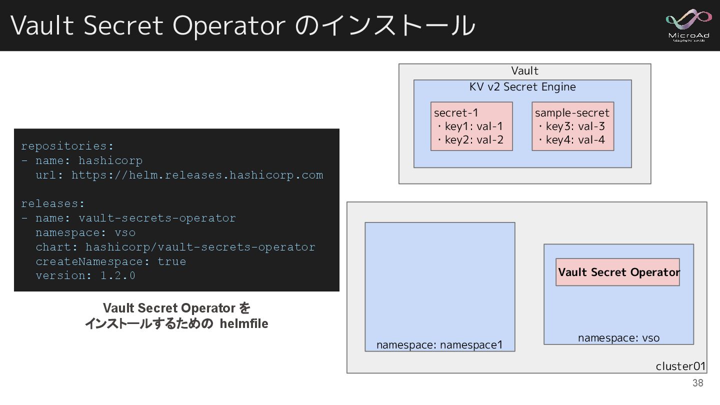Vault Secret Operator のインストール 38 repositories: - name: hashicorp url: