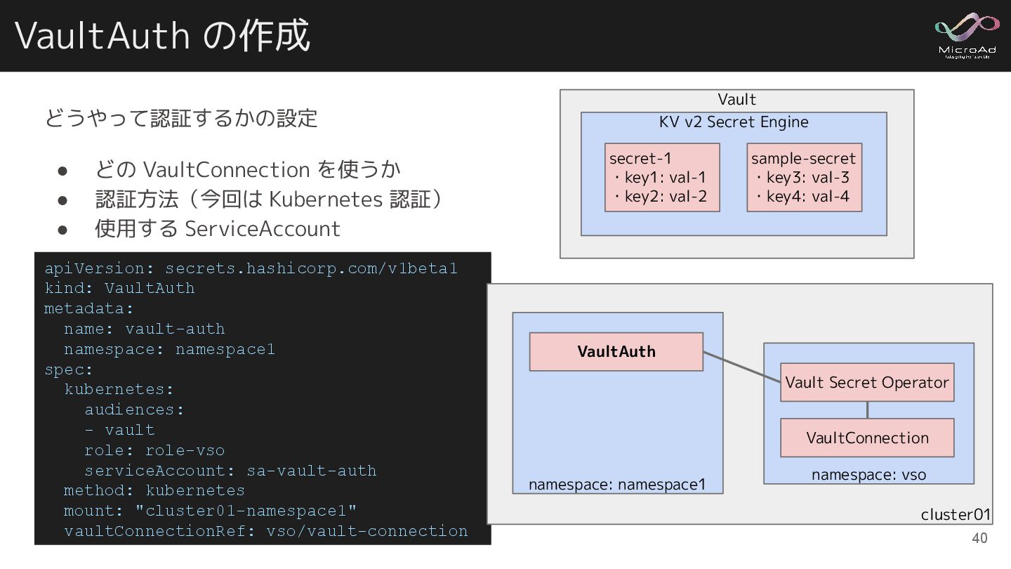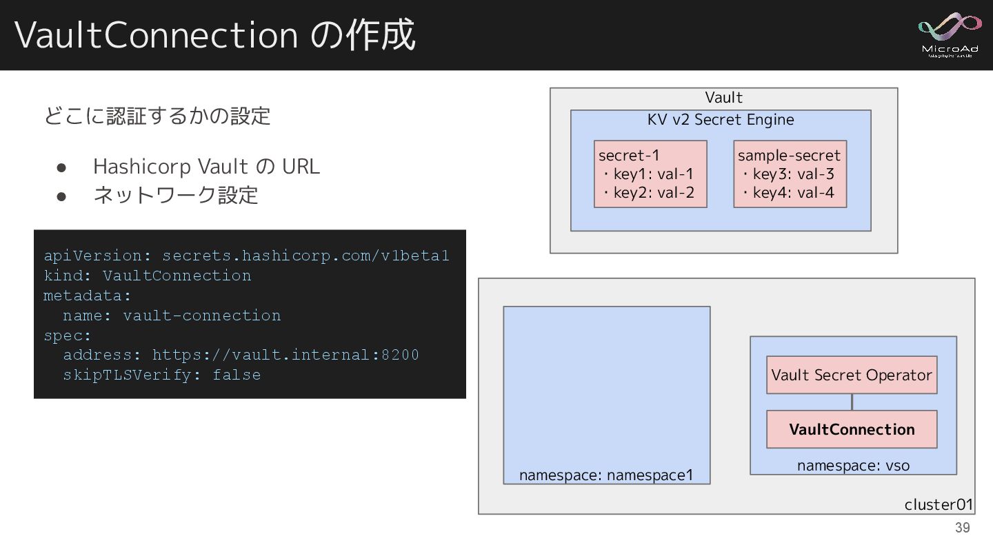 VaultConnection の作成 39 apiVersion: secrets.hashicorp.com/v1beta1 kind: VaultConnection metadata: name: vault-connection