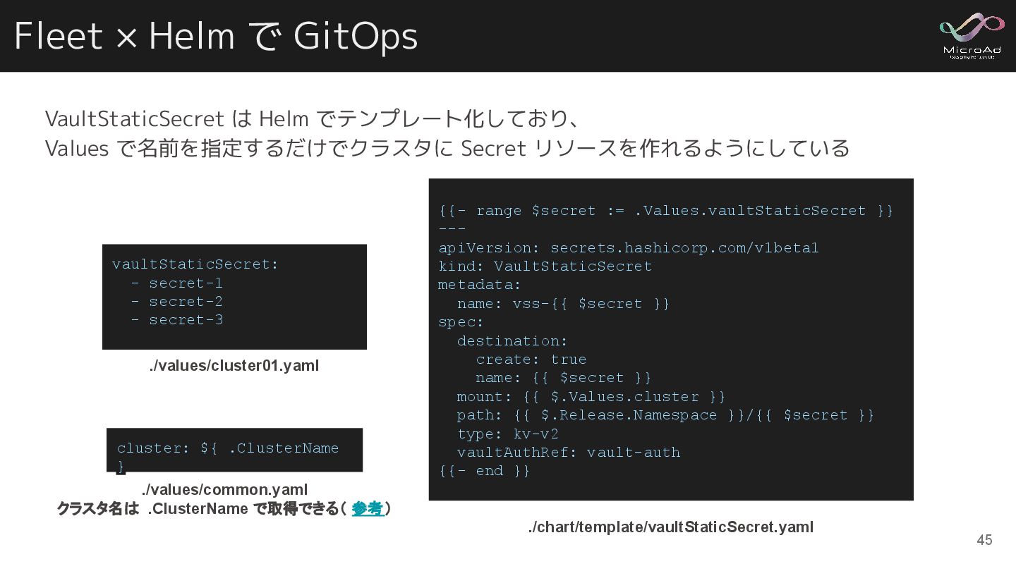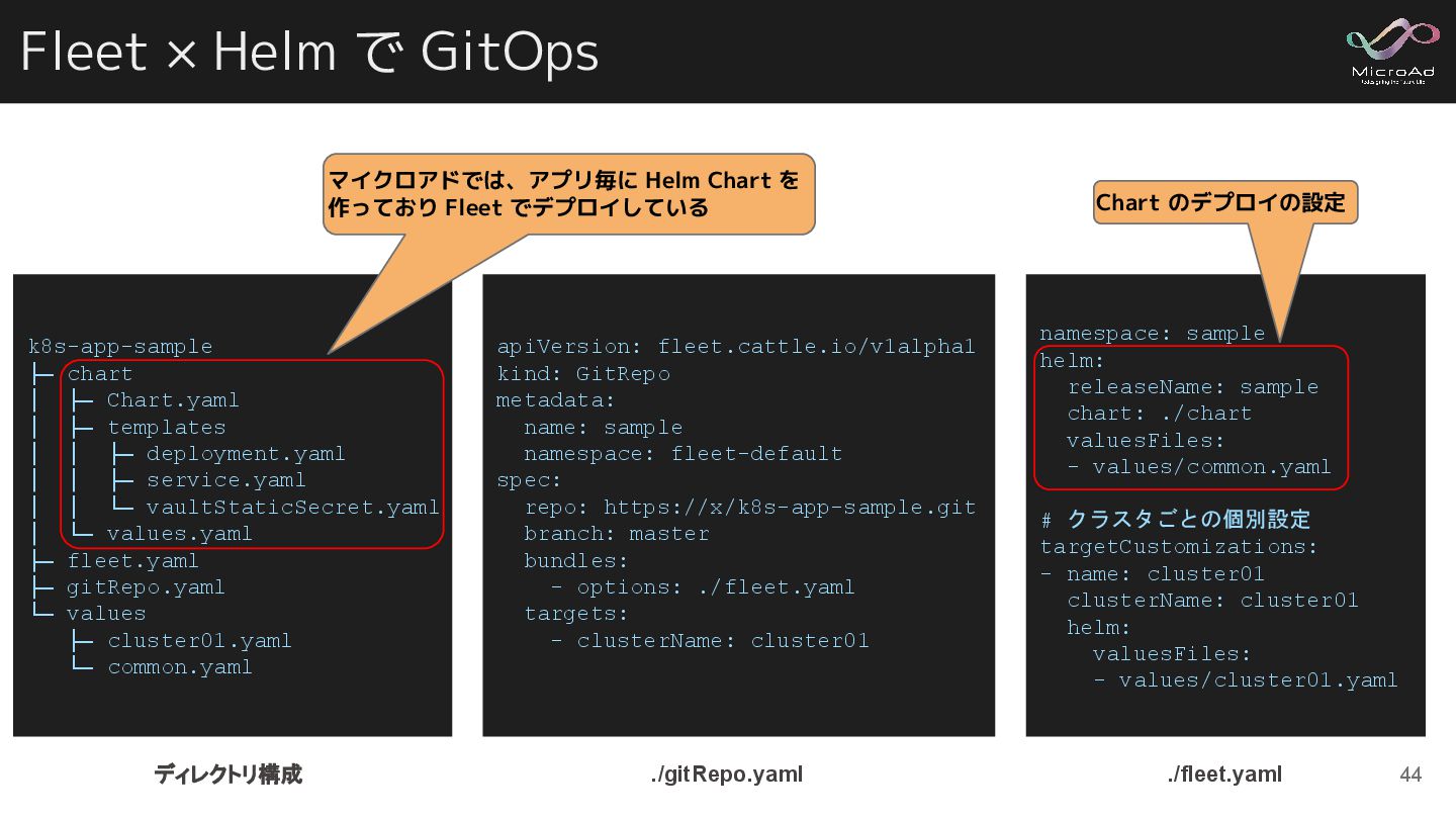 ├─ Chart.yaml │ ├─ templates │ │ ├─ deployment.yaml │ │ ├─ service.yaml │ │ └─ vaultStaticSecret.yaml │ └─ values.yaml ├─ fleet.yaml ├─ gitRepo.yaml └─ values ├─ cluster01.yaml └─ common.yaml apiVersion: fleet.cattle.io/v1alpha1 kind: GitRepo metadata: name: sample namespace: fleet-default spec: repo: https://x/k8s-app-sample.git branch: master bundles: - options: ./fleet.yaml targets: - clusterName: cluster01 namespace: sample helm: releaseName: sample chart: ./chart valuesFiles: - values/common.yaml # クラスタごとの個別設定 targetCustomizations: - name: cluster01 clusterName: cluster01 helm: valuesFiles: - values/cluster01.yaml ディレクトリ構成 ./gitRepo.yaml ./fleet.yaml マイクロアドでは、アプリ毎に Helm Chart を 作っており Fleet でデプロイしている Chart のデプロイの設定