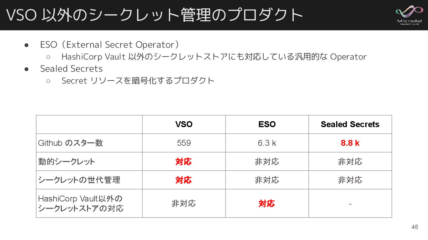 VSO 以外のシークレット管理のプロダクト • ESO(External Secret Operator) ◦ HashiCorp Vault 以外のシークレットストアにも対応している汎用的な