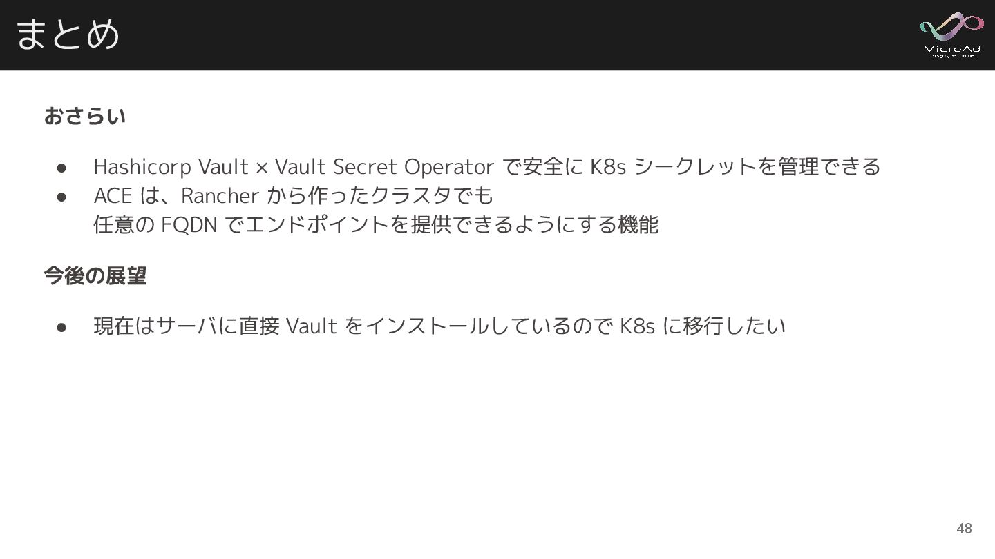 K8s シークレットを管理できる • ACE は、Rancher から作ったクラスタでも 任意の FQDN でエンドポイントを提供できるようにする機能 今後の展望 • 現在はサーバに直接 Vault をインストールしているので K8s に移行したい 48