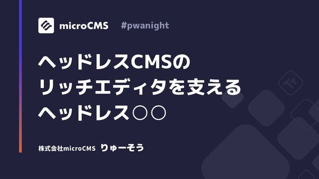 CSS. You are in full control over markup, styling and behaviour.” ◦ microCMSでは(新)リッチエディタで利用 Headless WYSIWYG Text EditorWYSIWYG Text EditorWYSIWYG Text Editor 11 #pwanight https://tiptap.dev/