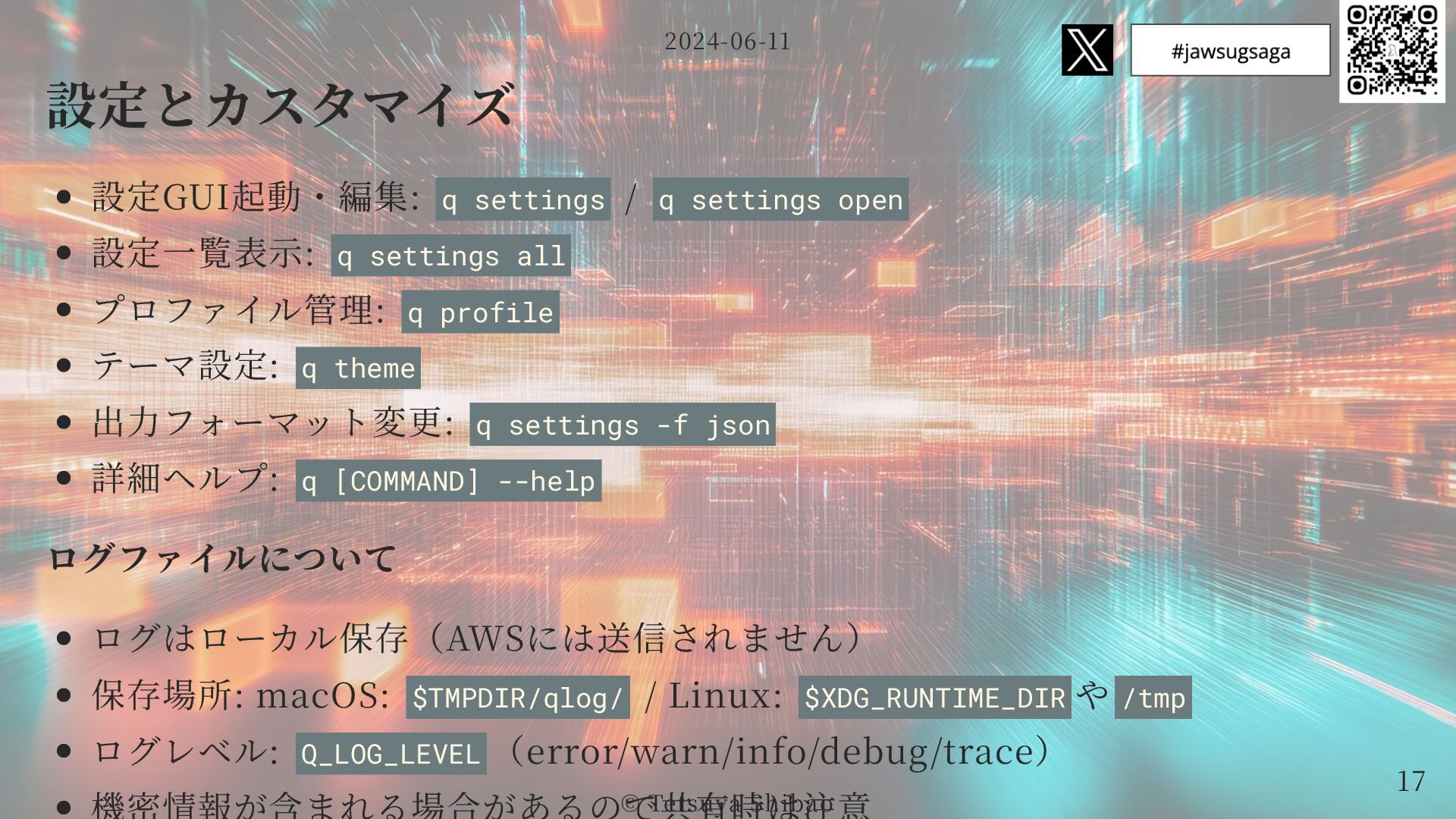 このスライド全体は、「Amazon Q Developer for CLI」の使い方・特徴・最新機能・安全な運用方法を、実際のコマンド例や活用シーンを交えて体系的に解説する内容です。 Amazon Q Developer for CLIの導入から実践・安全な活用まで、体系的に理解できる構成となっています。各スライドは、実際の現場ですぐに役立つ情報・コマンド例を中心にまとめています。