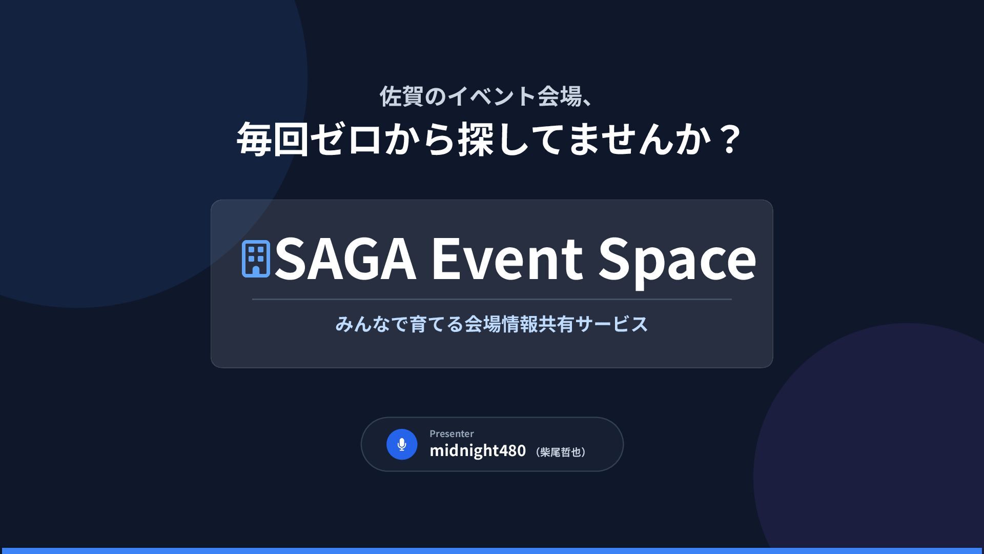 佐賀のイベント会場、 毎回ゼロから探してませんか? Presenter midnight480 (柴尾哲也) SAGA Event Space みんなで育てる会場情報共有サービス