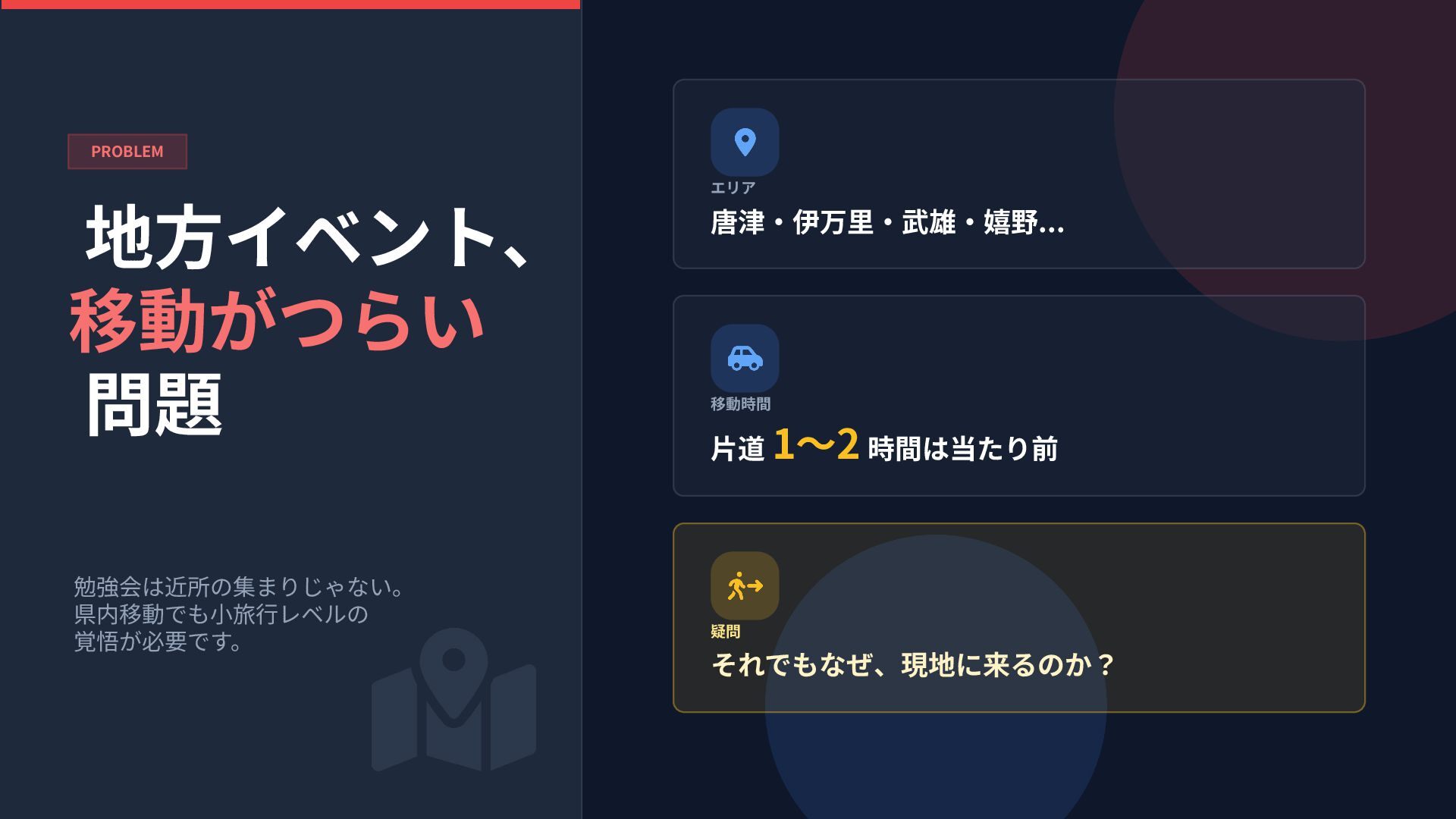 地⽅イベント、 移動がつらい 問題 勉強会は近所の集まりじゃない。 県内移動でも⼩旅⾏レベルの 覚悟が必要です。 PROBLEM エリア 唐津‧伊万⾥‧武雄‧嬉野... 移動時間