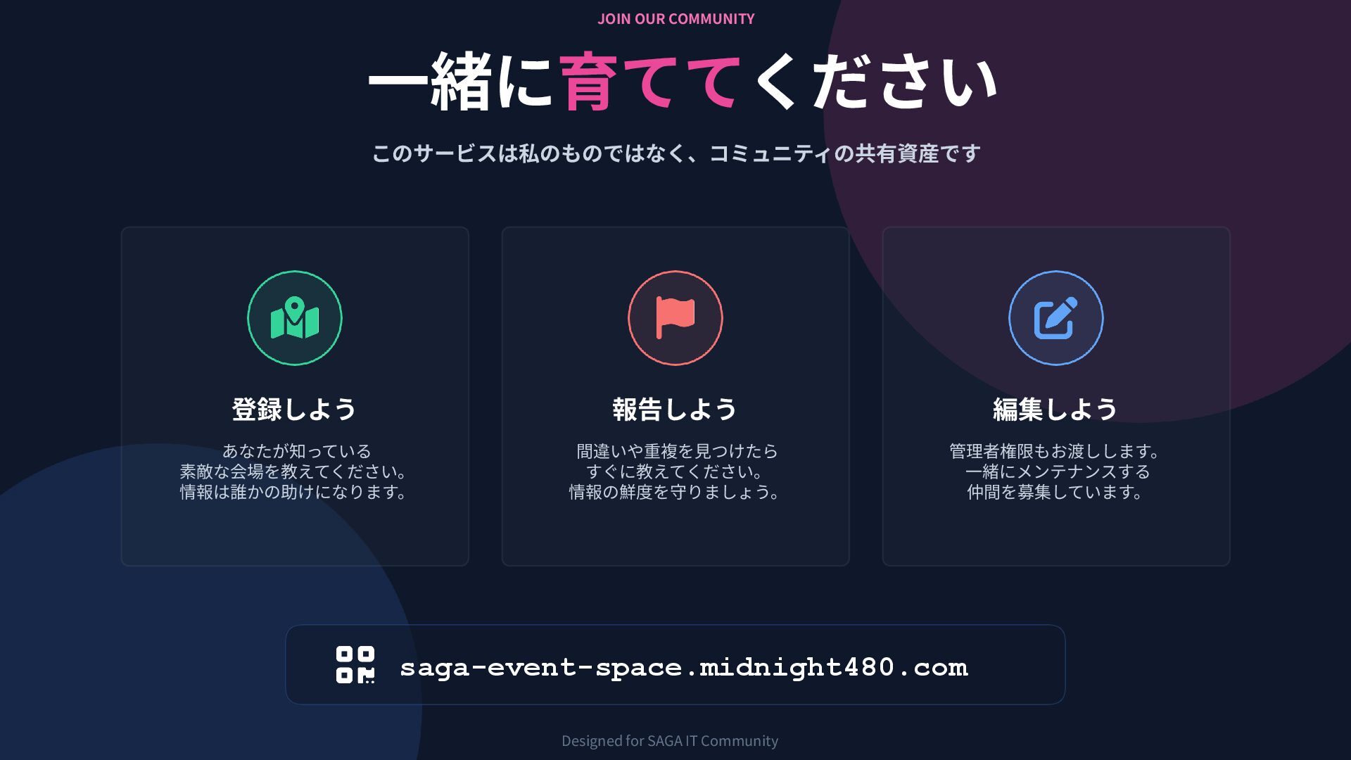 JOIN OUR COMMUNITY ⼀緒に育ててください このサービスは私のものではなく、コミュニティの共有資産です saga-event-space.midnight480.com Designed for SAGA IT