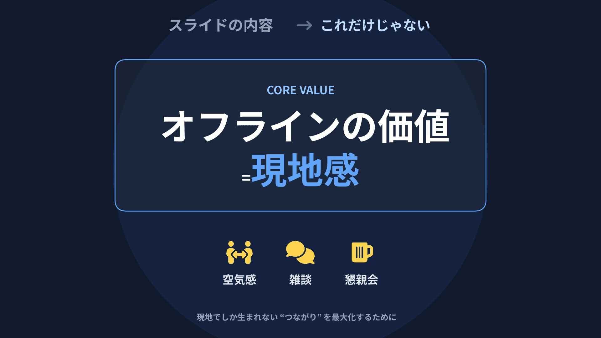 CORE VALUE オフラインの価値 = 現地感 空気感 雑談 懇親会 現地でしか⽣まれない “つながり”