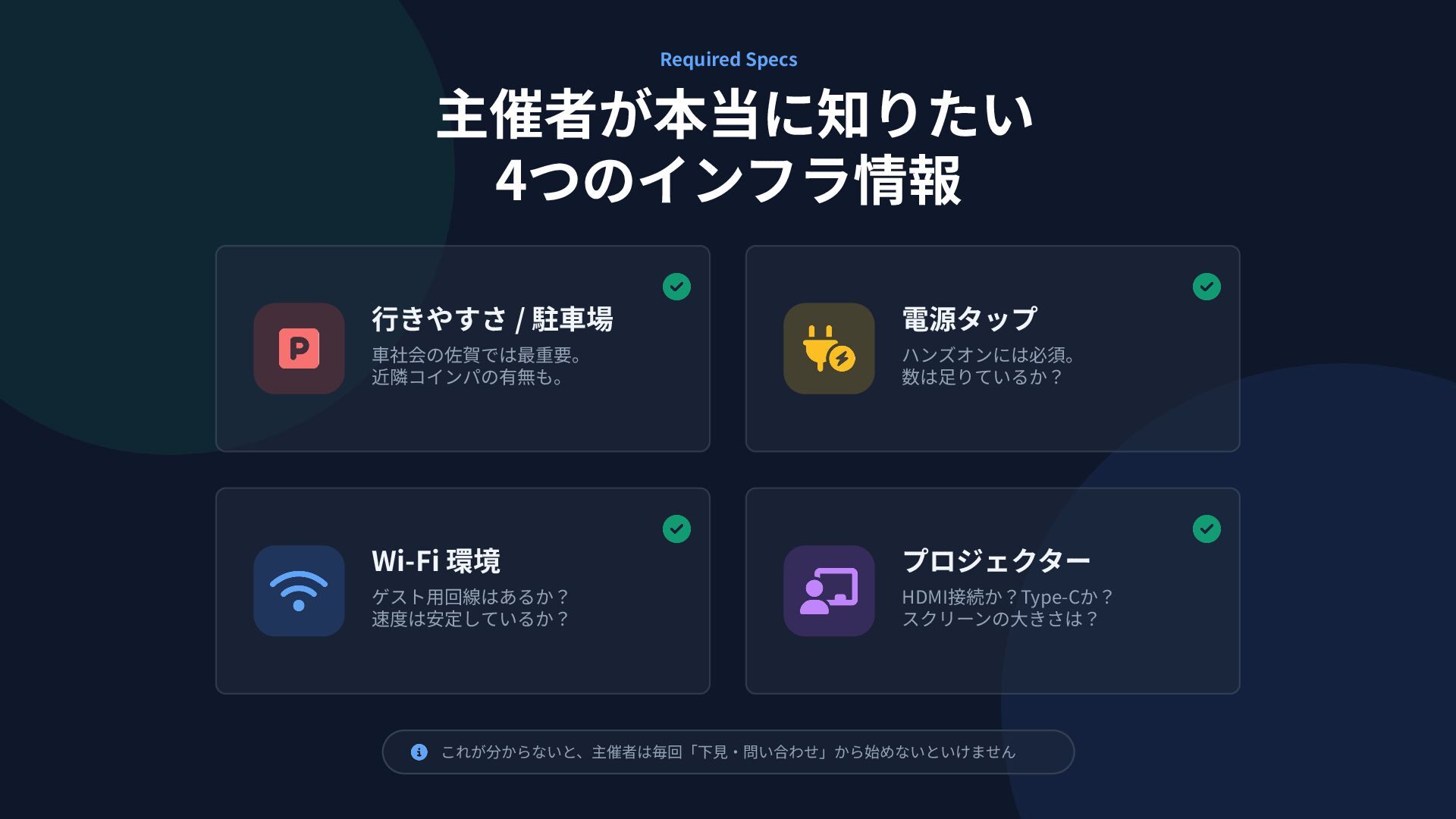 Required Specs 主催者が本当に知りたい 4つのインフラ情報 これが分からないと、主催者は毎回「下⾒‧問い合わせ」から始めないといけません ⾏きやすさ / 駐⾞場 ⾞社会の佐賀では最重要。 近隣コインパの有無も。