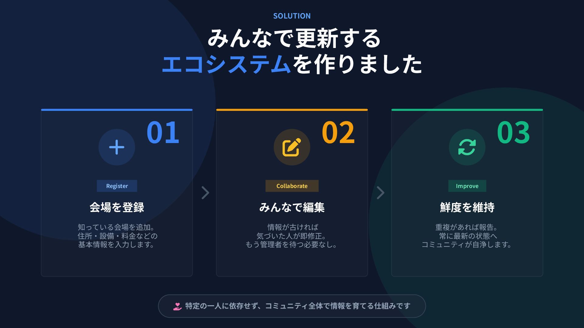 SOLUTION みんなで更新する エコシステムを作りました 特定の⼀⼈に依存せず、コミュニティ全体で情報を育てる仕組みです 01 Register 会場を登録 知っている会場を追加。 住所‧設備‧料⾦などの 基本情報を⼊⼒します。