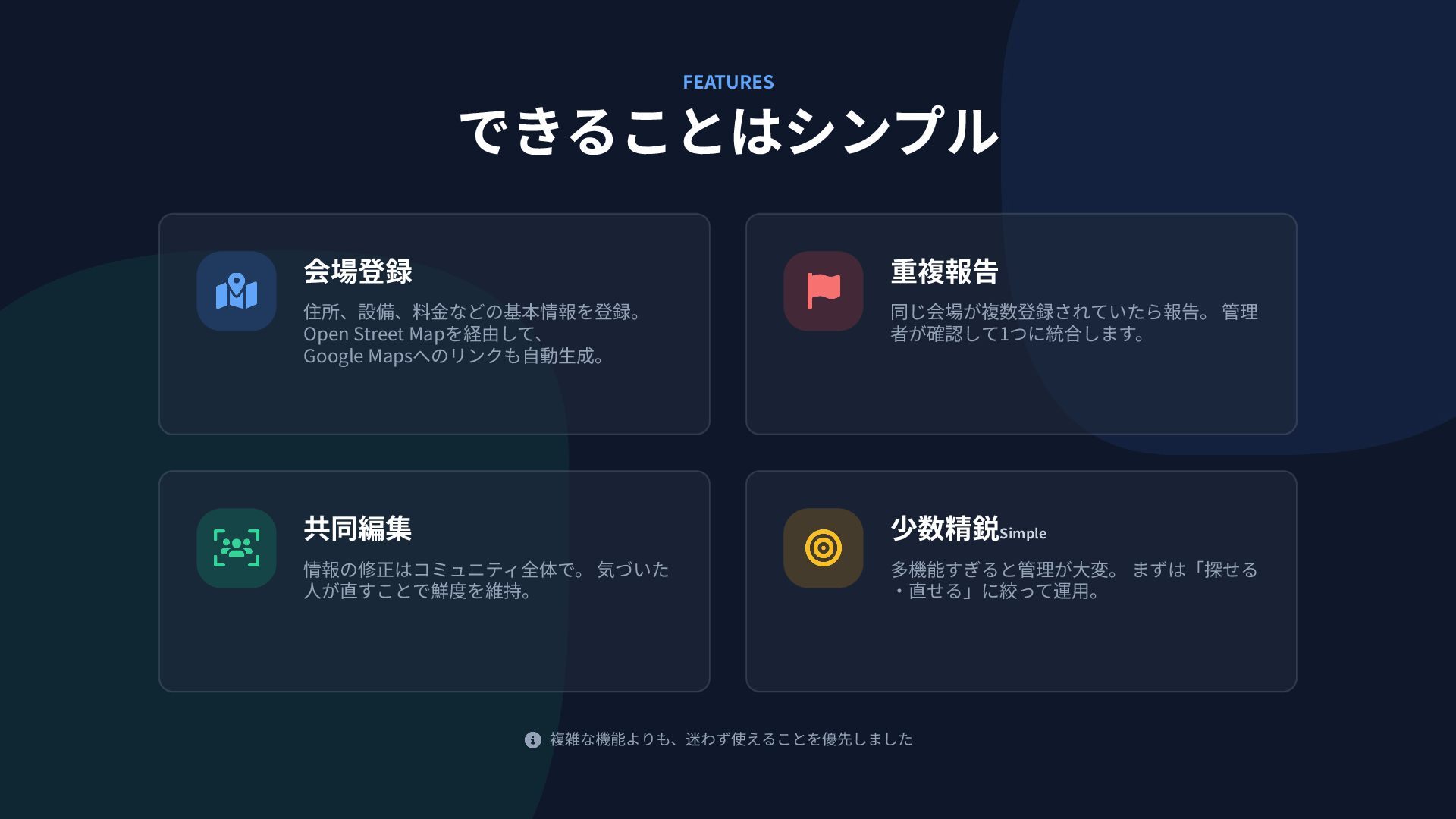 重複報告 同じ会場が複数登録されていたら報告。 管理 者が確認して1つに統合します。 共同編集 情報の修正はコミュニティ全体で。 気づいた ⼈が直すことで鮮度を維持。 少数精鋭Simple 多機能すぎると管理が⼤変。 まずは「探せる ‧直せる」に絞って運⽤。