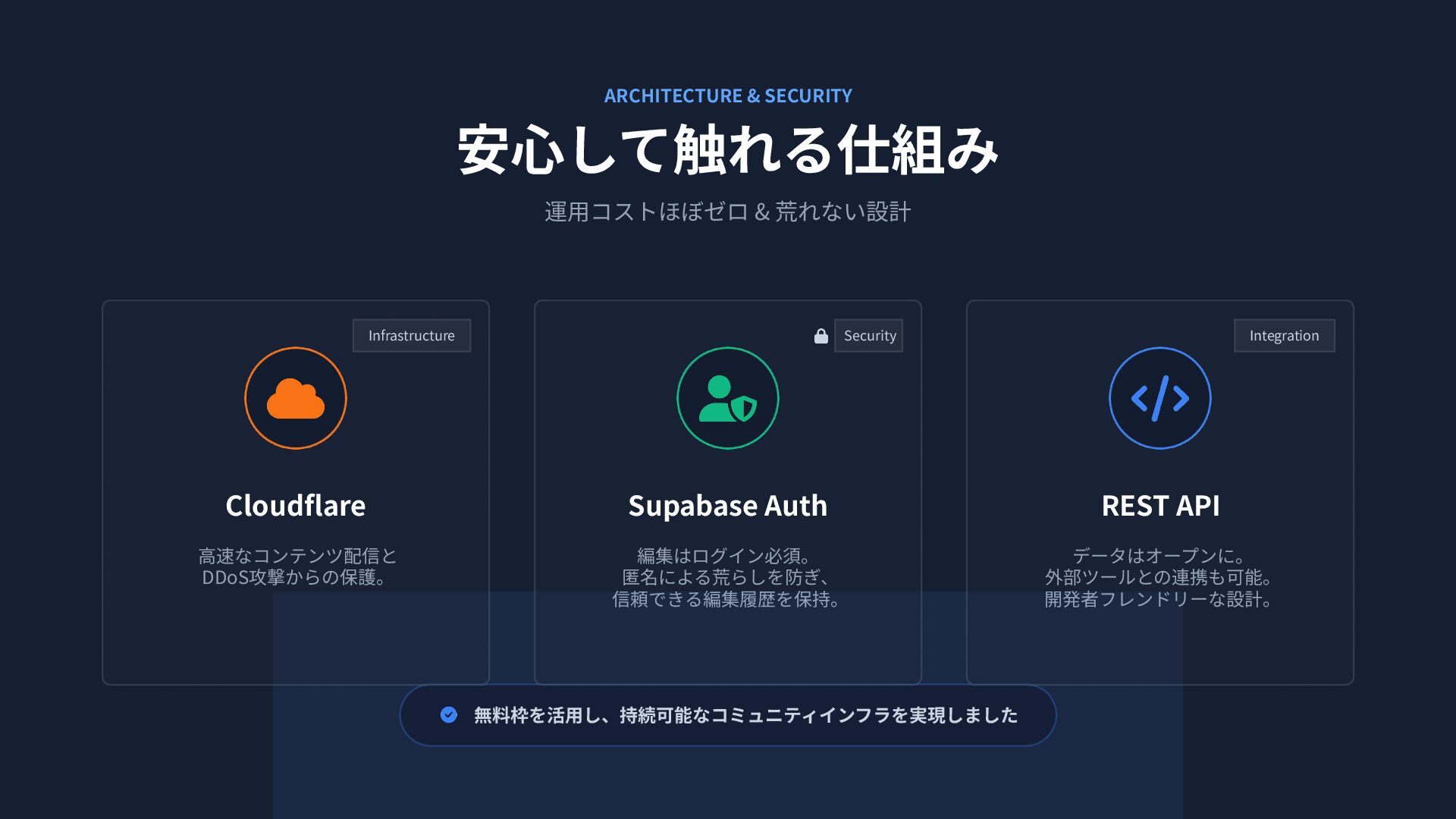 ARCHITECTURE & SECURITY 安⼼して触れる仕組み 運⽤コストほぼゼロ & 荒れない設計 無料枠を活⽤し、持続可能なコミュニティインフラを実現しました Infrastructure Cloudflare