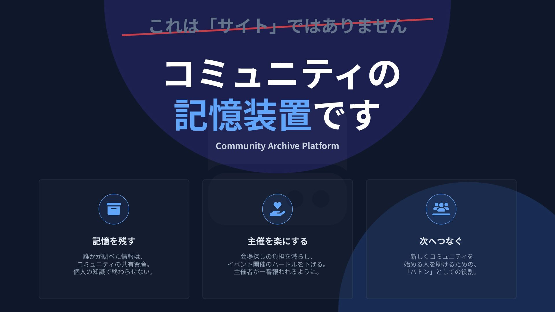 始める⼈を助けるための、 「バトン」としての役割。 これは「サイト」ではありません コミュニティの 記憶装置です Community Archive Platform