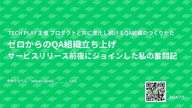 2024/07/05に開催された「【令和トラベル×ウェルスナビ×カカクコム】 プロダクトと共に進化し続けるQA組織のつくりかた」で登壇した発表資料です。