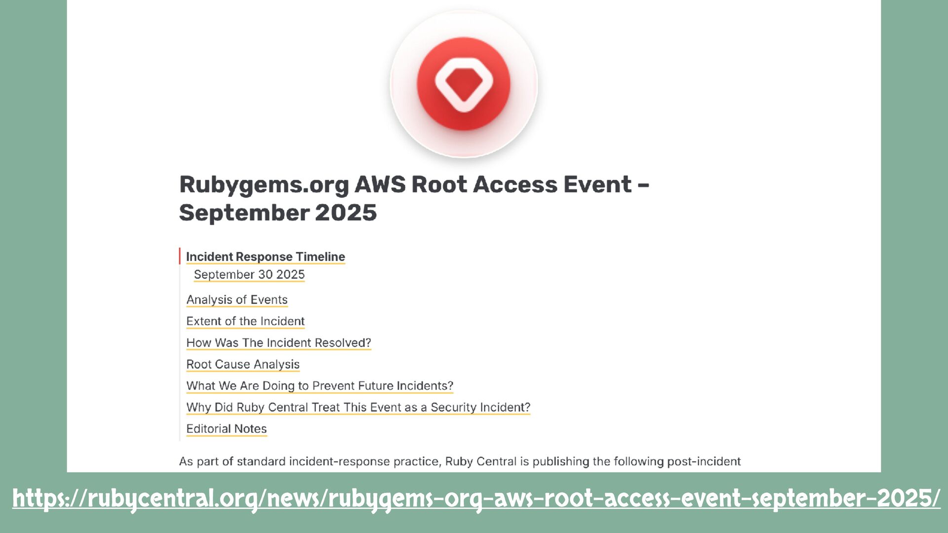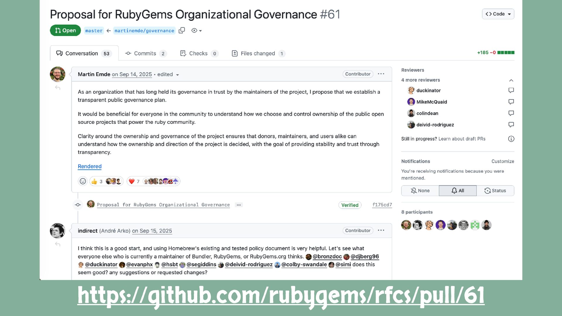 In September and October 2025, RubyGems and Bundler maintainers were removed by RubyCentral; some repos moved to the Ruby organization and former maintainers created gem.coo p. I share lessons for non-Ruby projects on non-profits, governance, money and access in open source, drawn from mediating the dispute and helping gem.coop bootstrap governance, without taking sides.