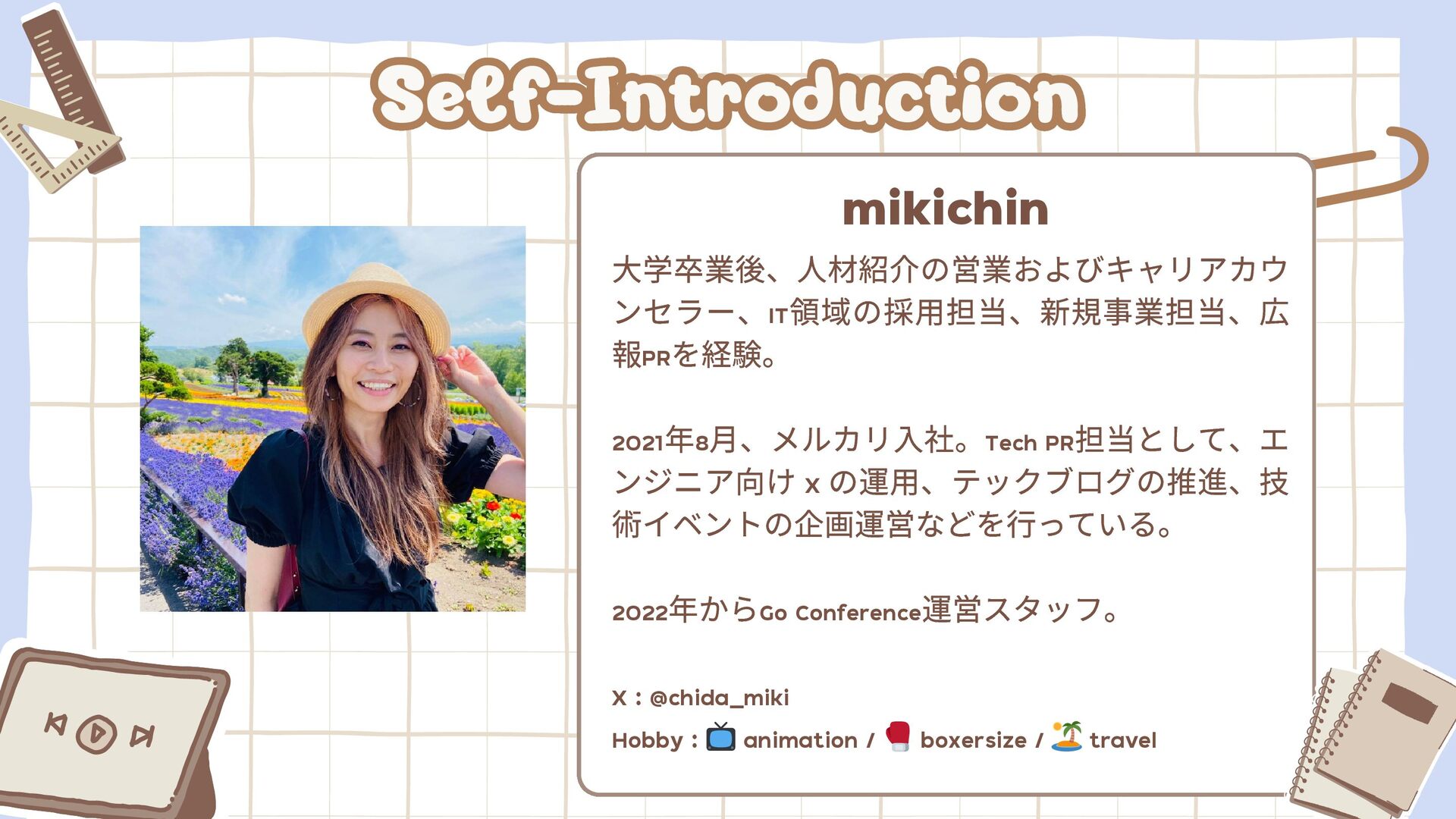 月、メルカリ入社。Tech PR 担当として、エ ンジニア向け X の運用、テックブログの推進、技 術イベントの企画運営などを行っている。 2022 年からGo Conference 運営スタッフ。 X : @chida_miki Hobby : 📺 animation / 🥊 boxersize / 🏝 travel