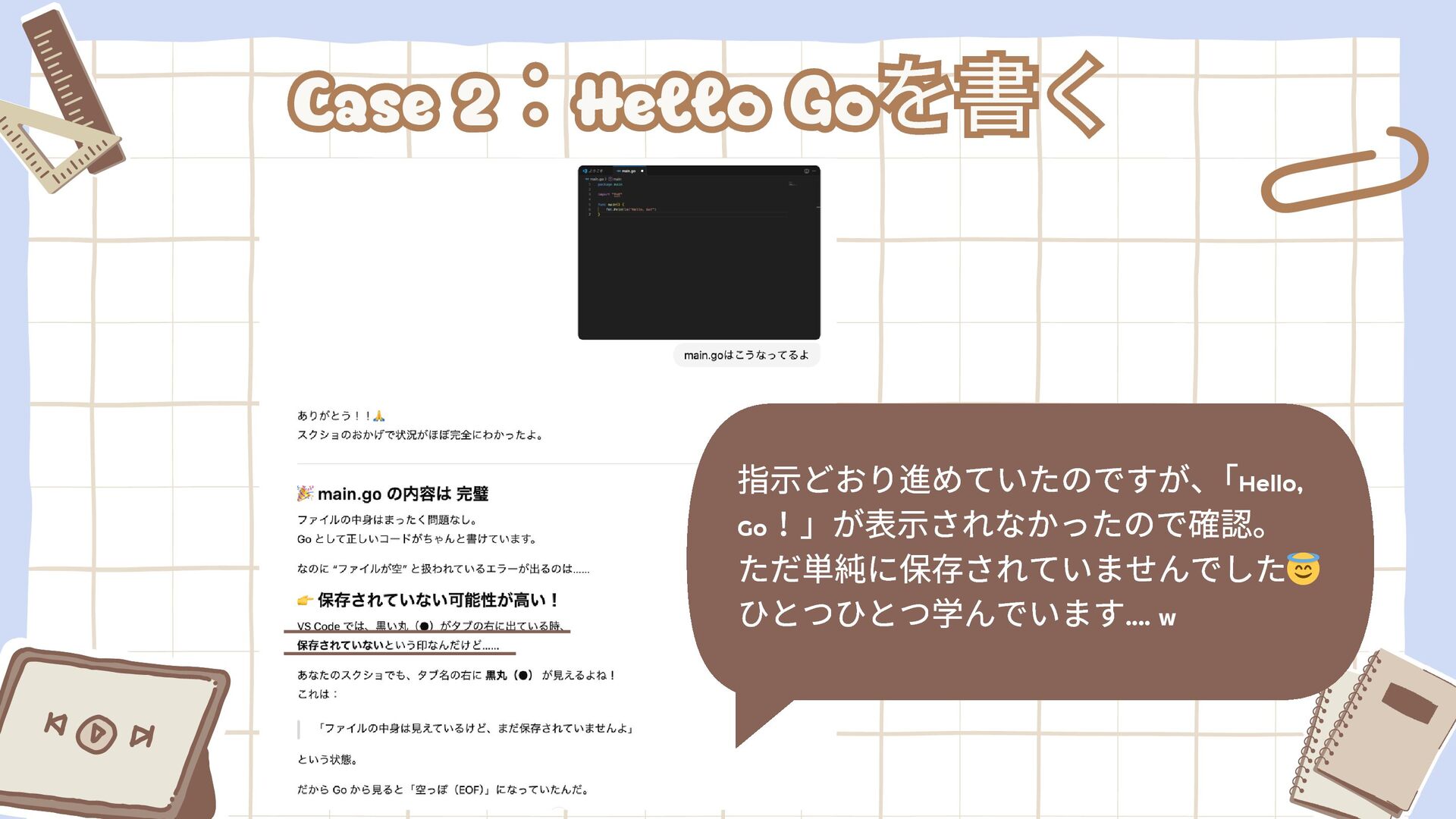 5. Case 2:Hello Goを書く Case 2 :Hello Go を書く 指示どおり進めていたのですが、 「Hello,