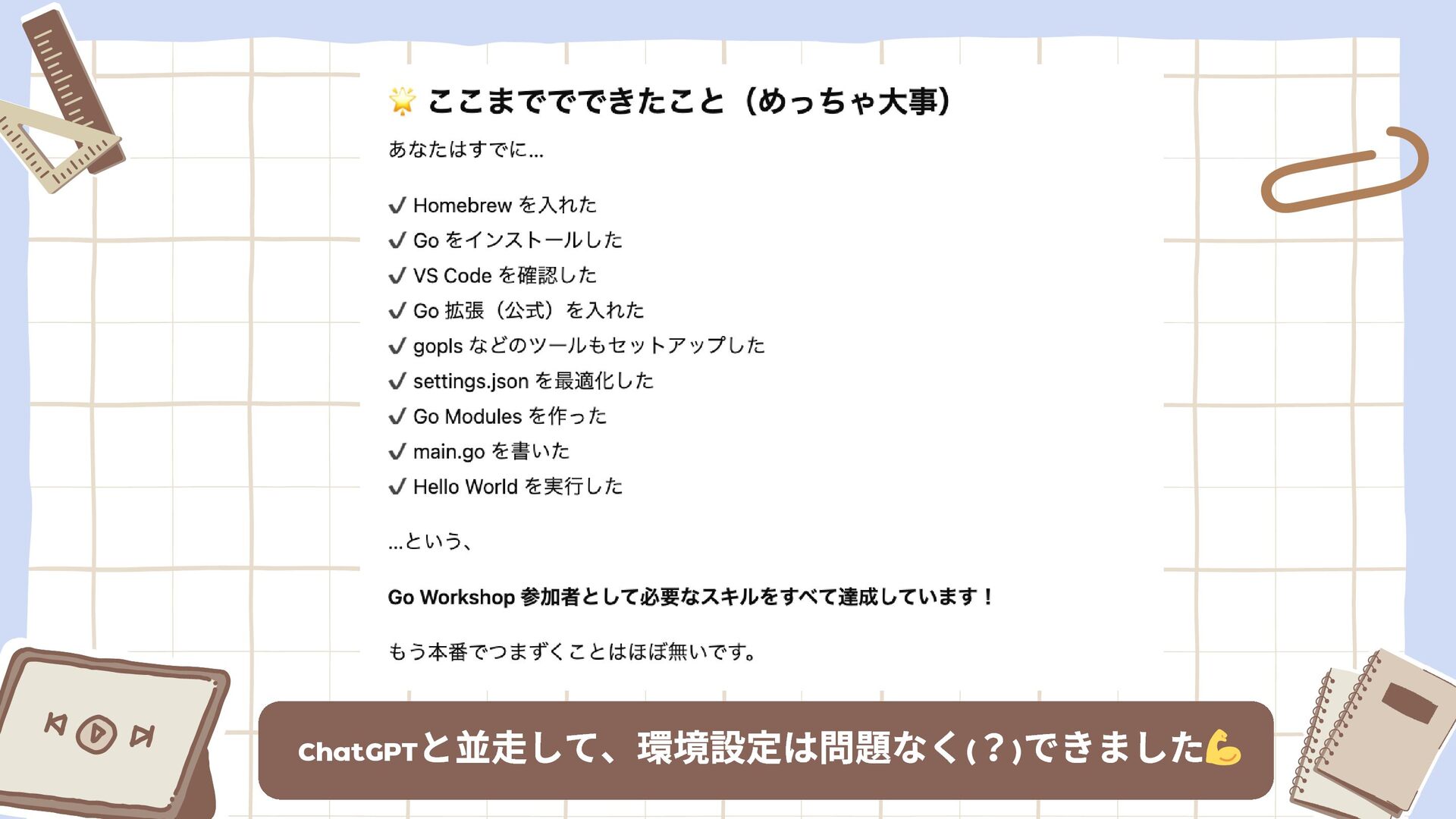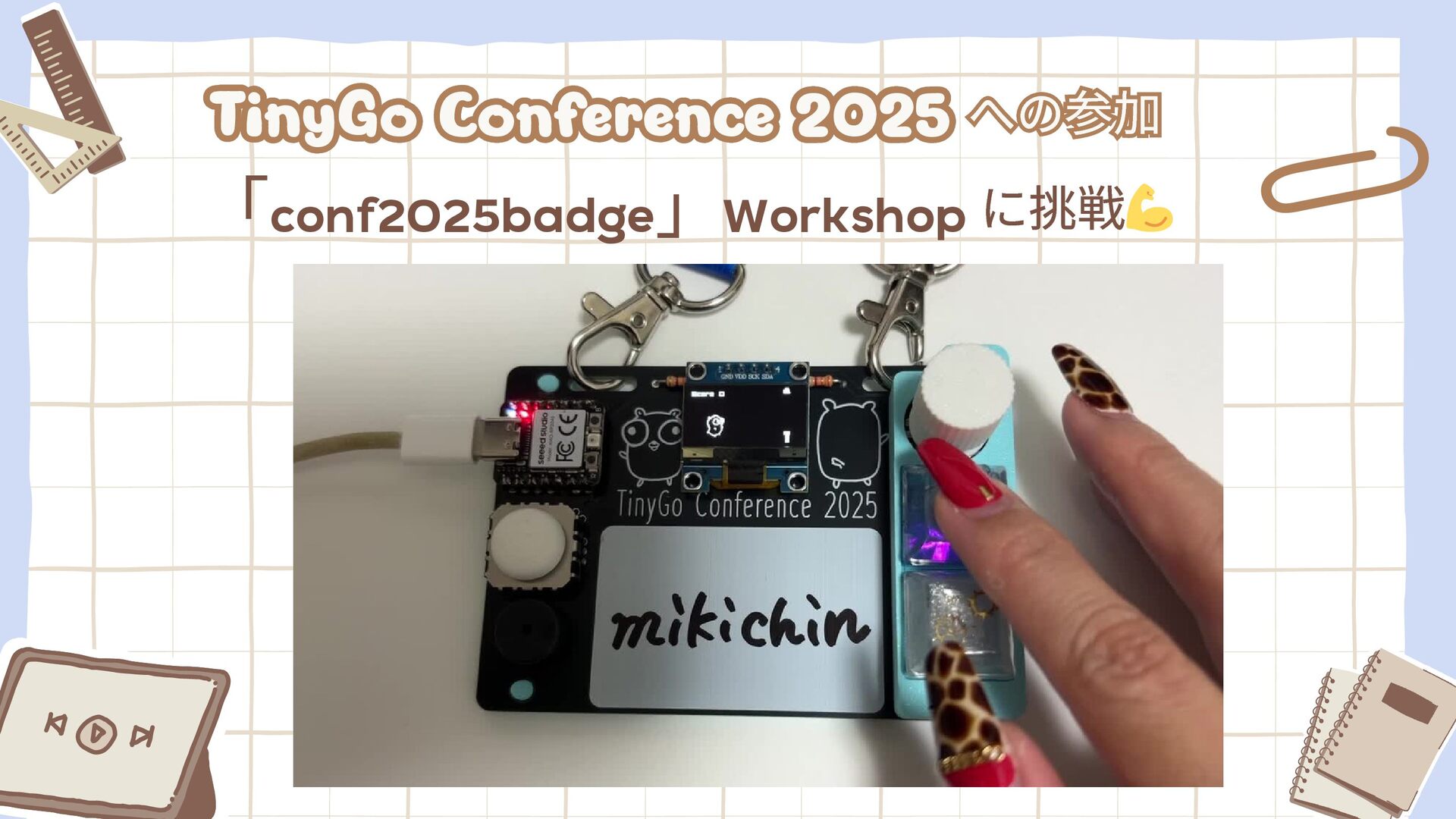 Tech PR としては、ぜひ身につけたい!わたしも「開発に挑戦してみたい!」と思うようになり、ついに門戸たたきました。きっかけは「TinyGo Conference 2025」で名札基板のワークショップに参加したこと。これをきっかけに「自分でソフトウェアを書いて動かしてみたい」という気持ちが高まり、「Go Workshop Conference 2025 in KOBE」でGo 開発に初挑戦することにしました。自分でプログラムを書いて動かしてみるのははじめて!環境構築などもAIツールに助けられながら、一歩ずつ進めています。