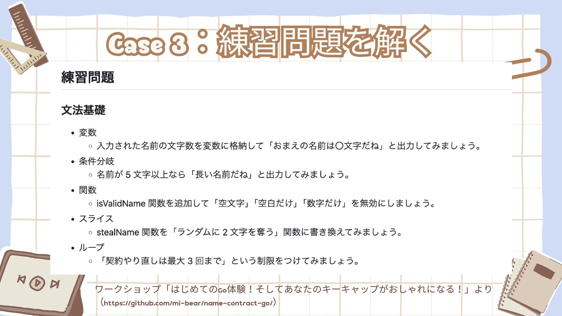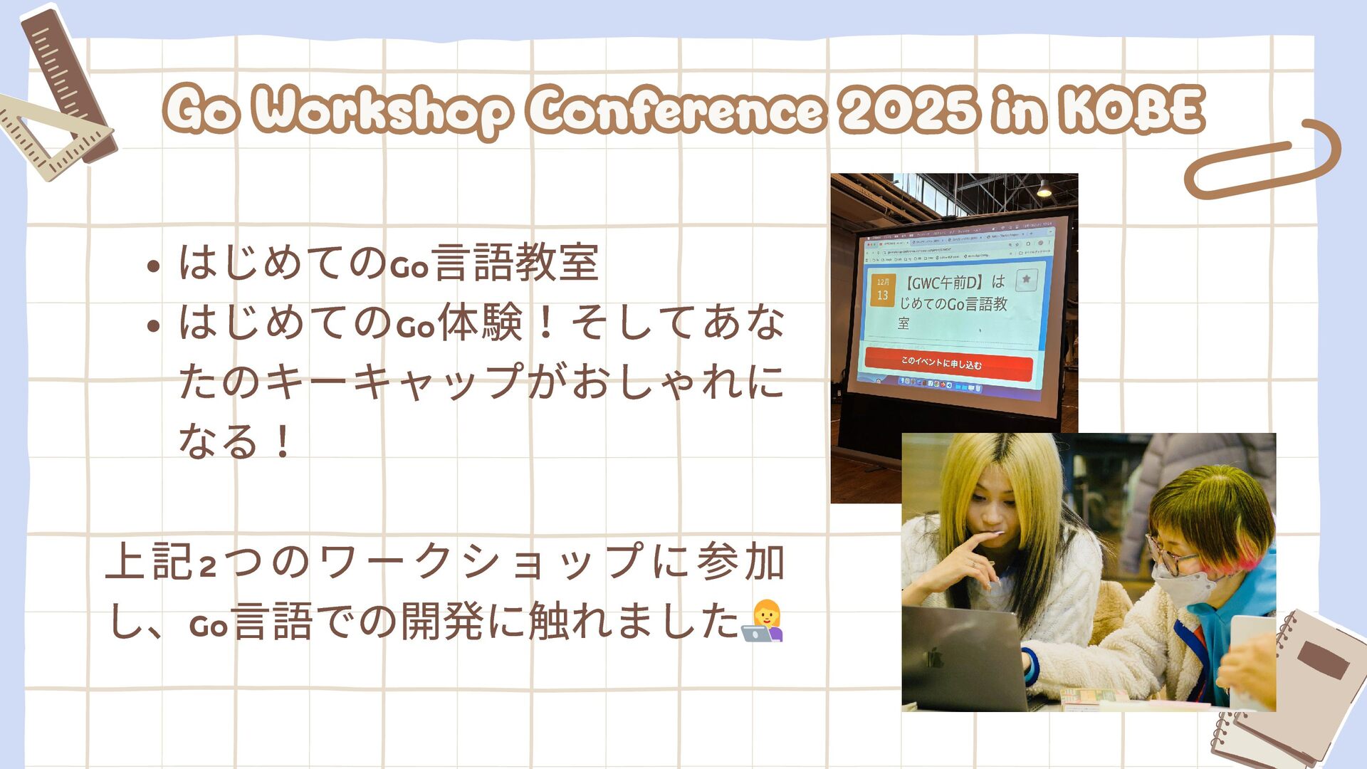 in KOBE はじめてのGo 言語教室 はじめてのGo 体験!そしてあな たのキーキャップがおしゃれに なる! 上記2 つのワークショップに参加 し、Go 言語での開発に触れました👩‍💻