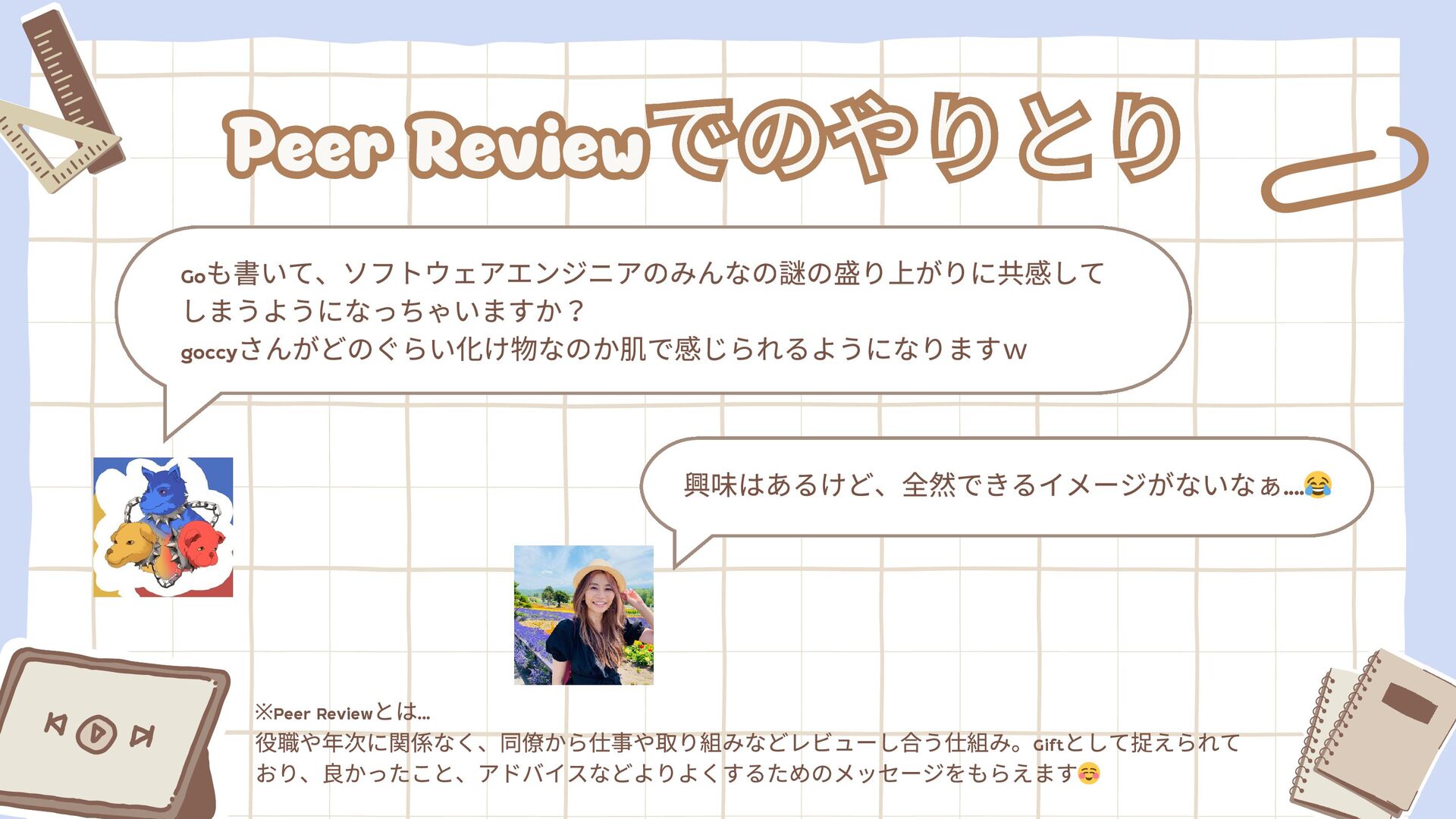 ※Peer Review とは... 役職や年次に関係なく、同僚から仕事や取り組みなどレビューし合う仕組み。Gift として捉えられて おり、良かったこと、アドバイスなどよりよくするためのメッセージをもらえます☺️ 興味はあるけど、全然できるイメージがないなぁ.... 😂
