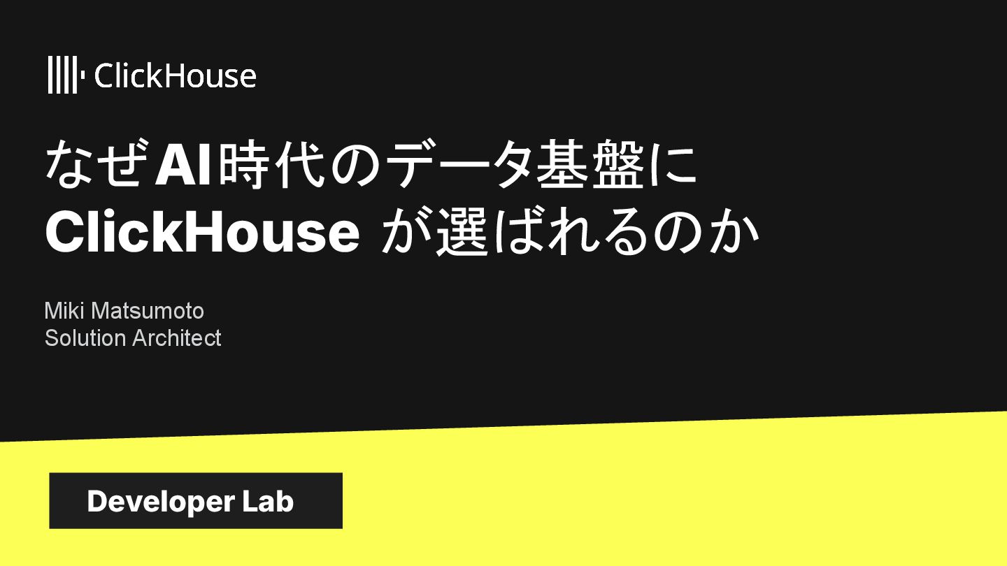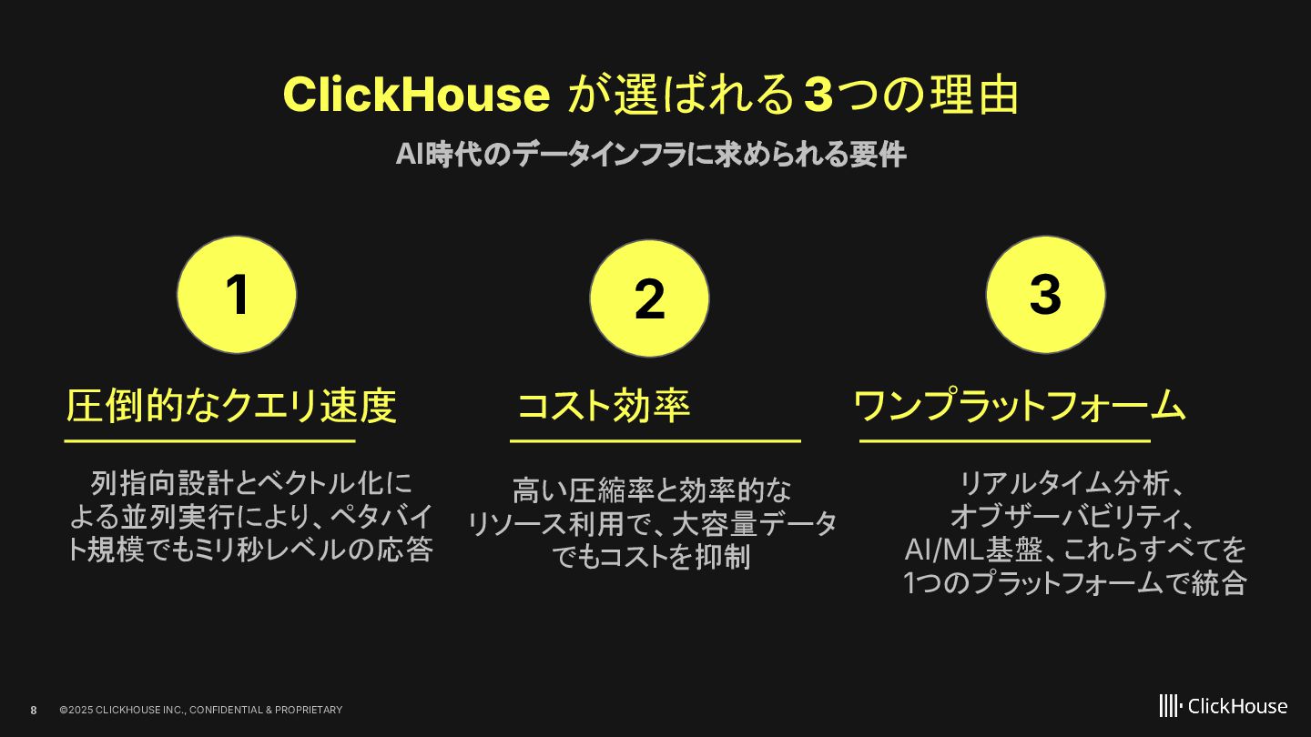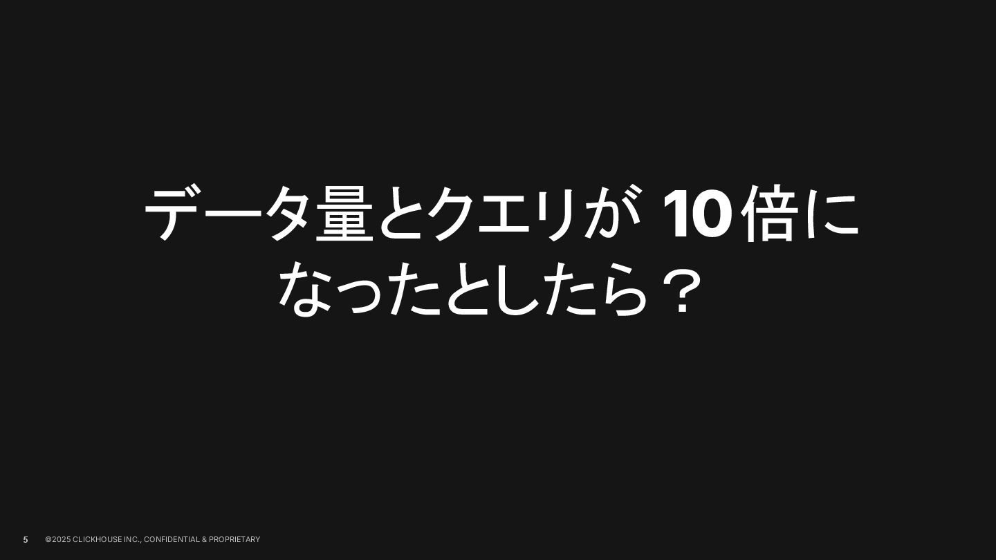 課題 ClickHouseの役割 • 可用性:水平・垂直スケールの限界 • 信頼性:データ欠損が現実世界の影響につながる • コスト効率:数年分のデータ保持 + 複雑・ 高カーディナリティ分析が必要 パフォーマンス検証にて、 10億レコード /秒 取り込みを継続し、 累計1,000兆レコード を達成 • 全社・全製品データを単一基盤で統合可能 • データ欠損による製造停止・障害検知遅延を防止 • トレンド分析・品質改善・予兆検知が可能 インフラ、Gigafactory、コネクテッドカーなど全領域の メトリクスの リアルタイムオブザーバビリティ・分析基盤 世界最大のEVメーカー