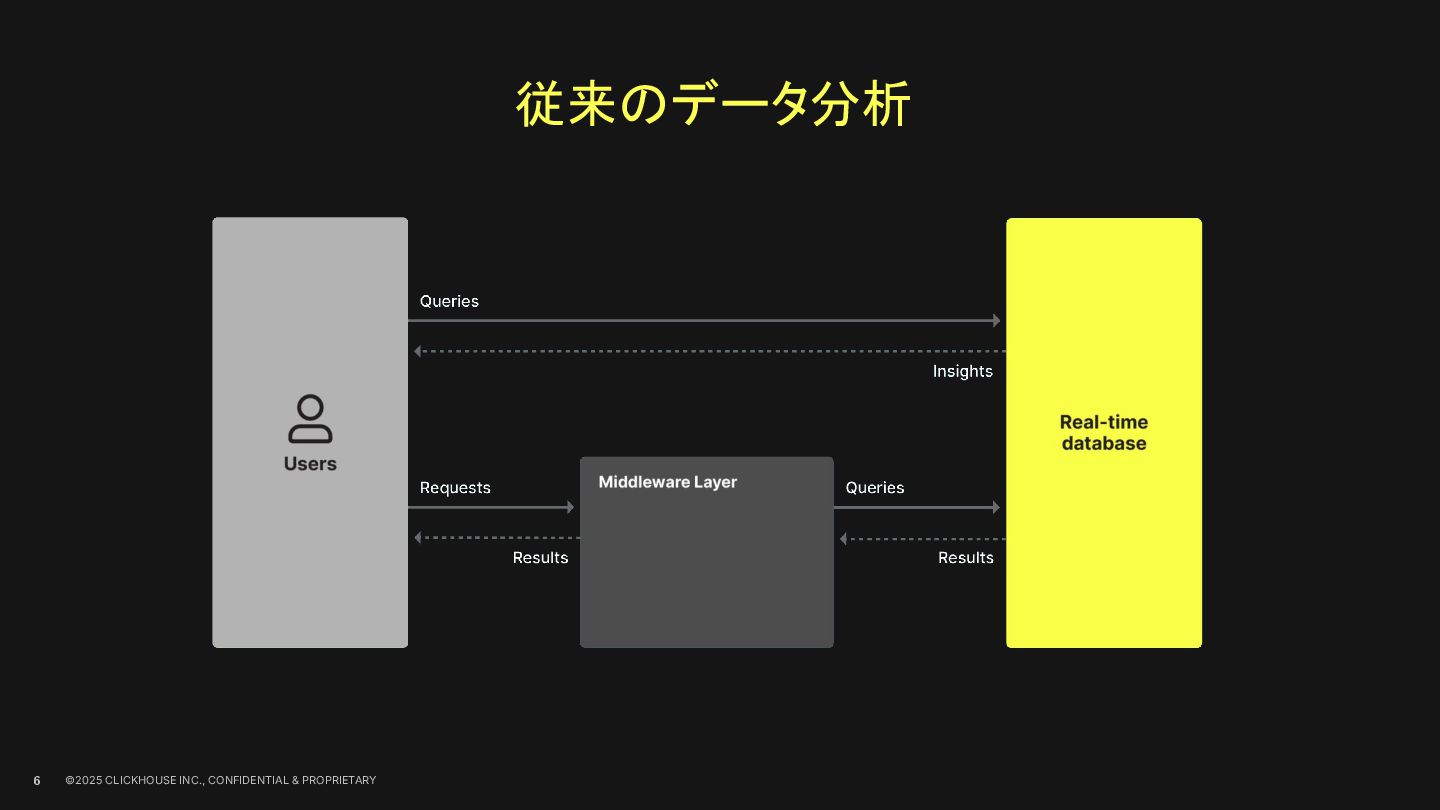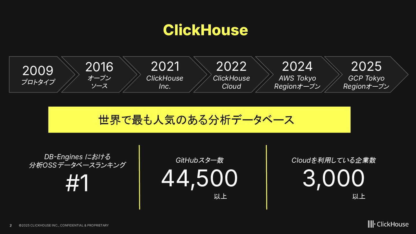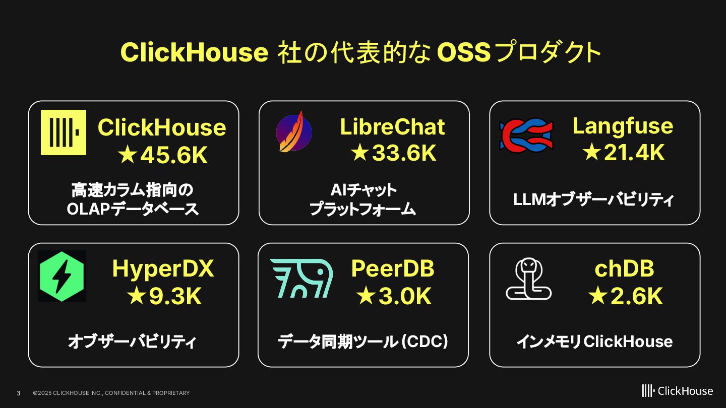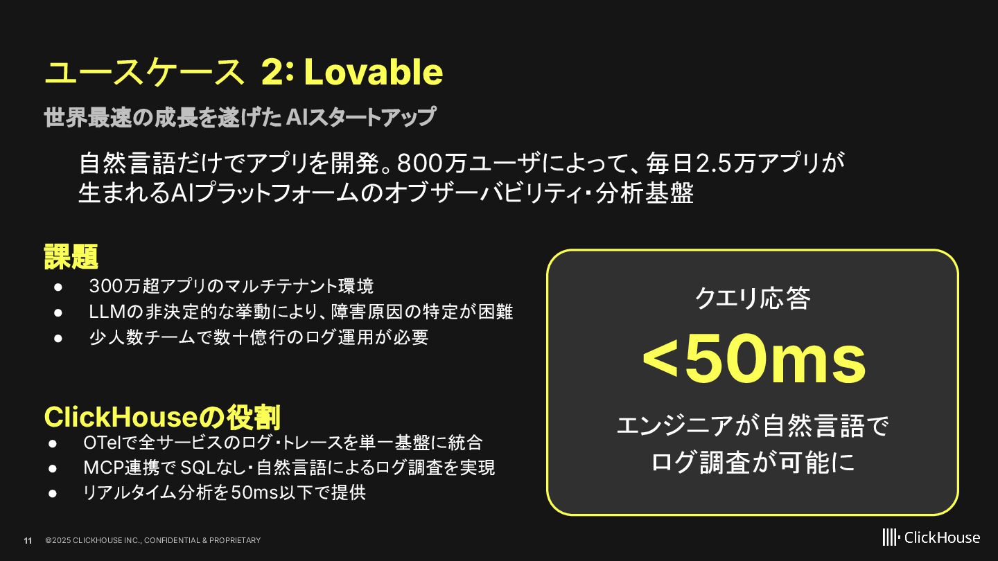 課題 ClickHouseの役割 • 可用性:水平・垂直スケールの限界 • 信頼性:データ欠損が現実世界の影響につながる • コスト効率:数年分のデータ保持 + 複雑・ 高カーディナリティ分析が必要 パフォーマンス検証にて、 10億レコード /秒 取り込みを継続し、 累計1,000兆レコード を達成 • 全社・全製品データを単一基盤で統合可能 • データ欠損による製造停止・障害検知遅延を防止 • トレンド分析・品質改善・予兆検知が可能 インフラ、Gigafactory、コネクテッドカーなど全領域の メトリクスの リアルタイムオブザーバビリティ・分析基盤 世界最大のEVメーカー